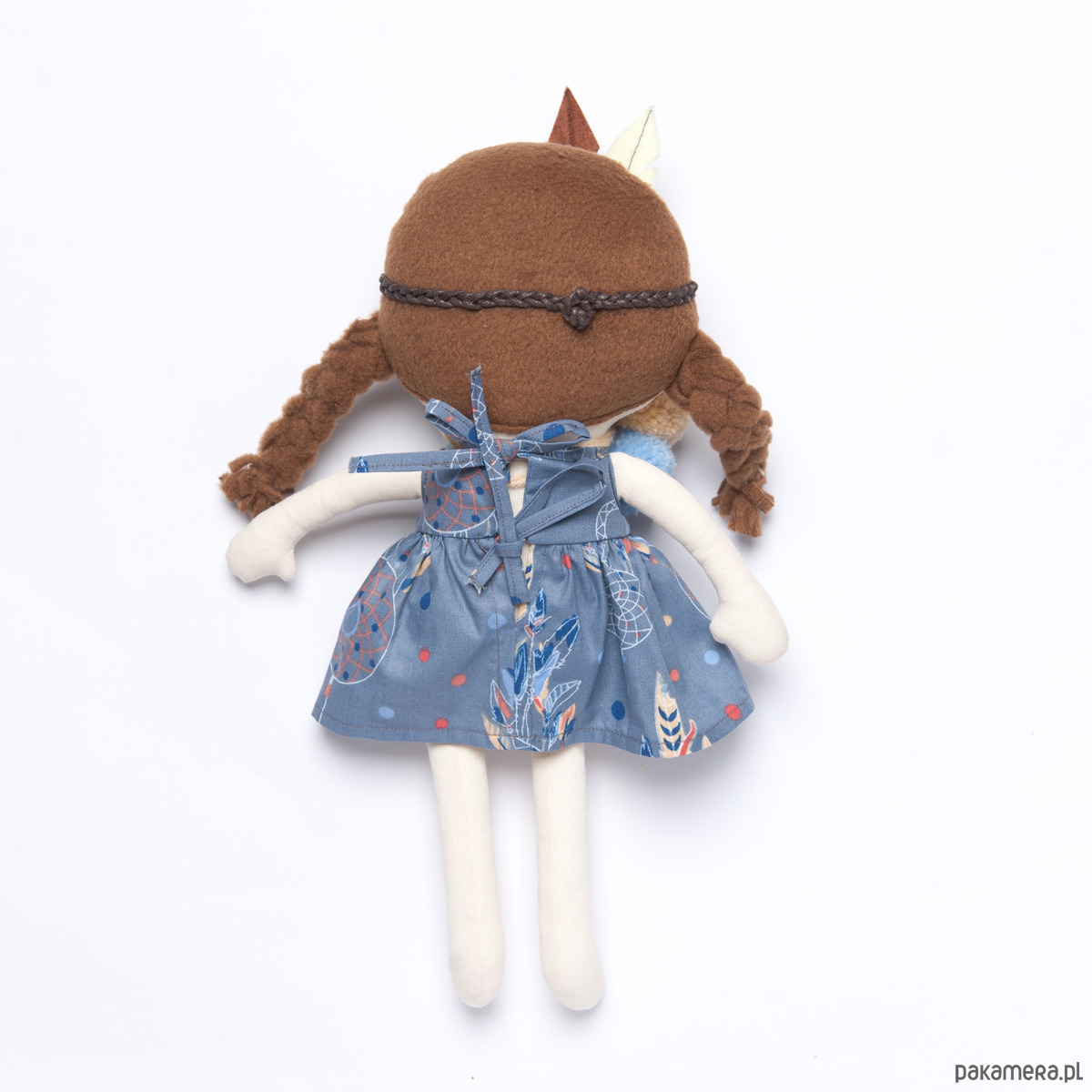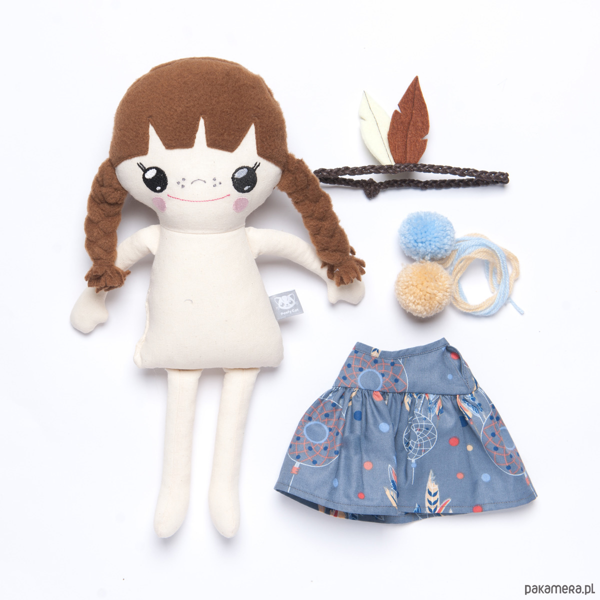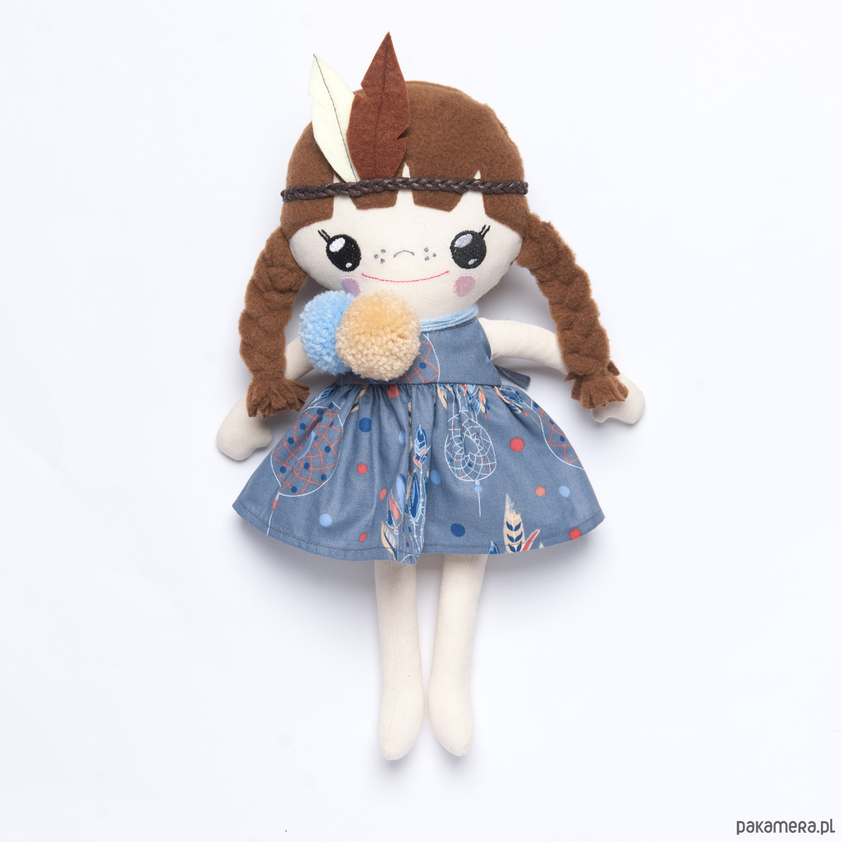Dodatkowo laleczka posiada opaskę z filcowym pióropuszem oraz kolorowe pompony.