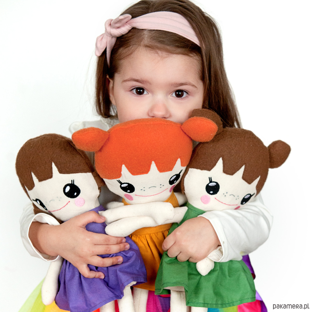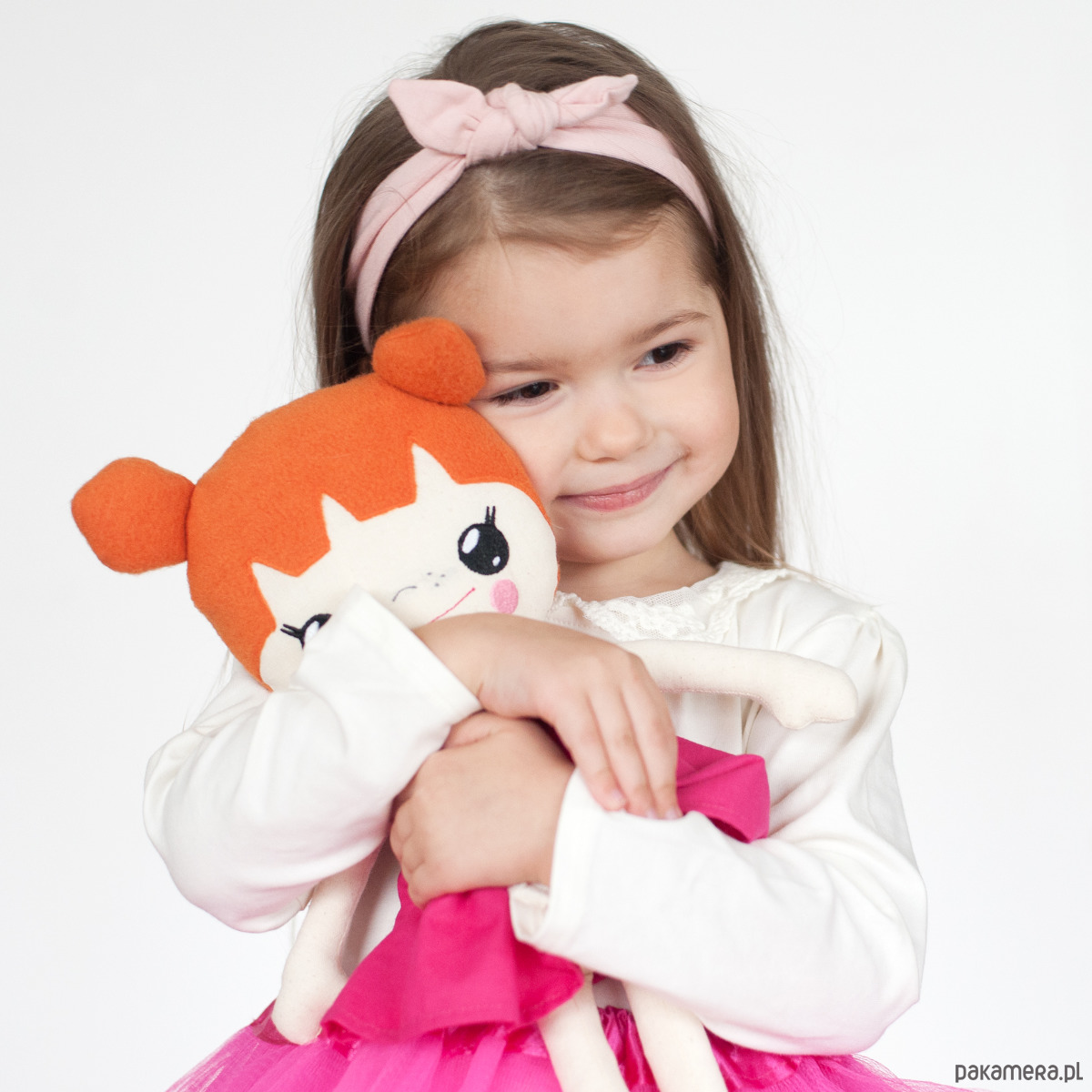 Włosy z miękkiego polaru, twarz lalki jest wyhaftowana.