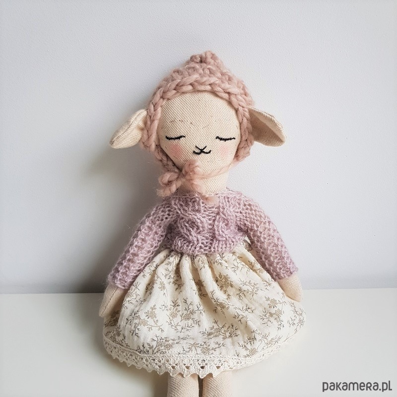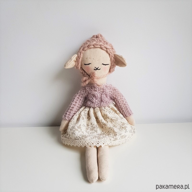Owca Pola w spódniczce z bawełny organicznej w gałązki oraz sweterku moherowym w kolorze różowym..