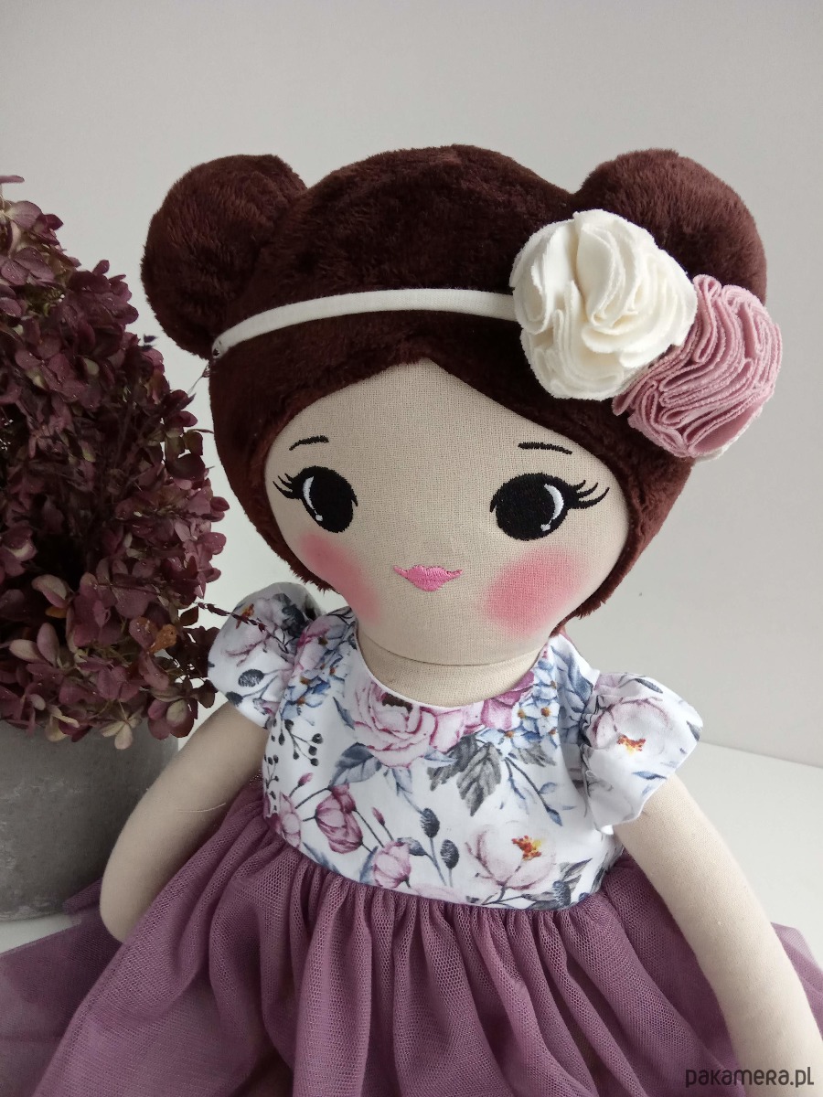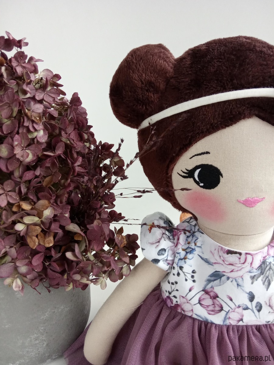 Uszyta z tkaniny bawełnianej, włosy minki. Wypełniona antyalergiczną kulką silikonową. Twarz haftowana.