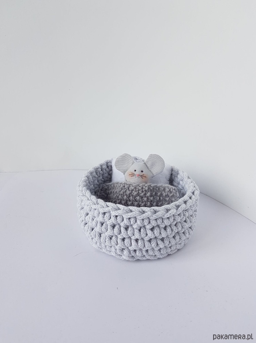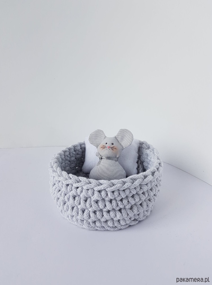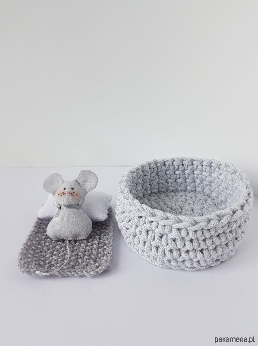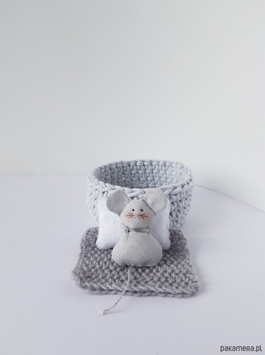 Zabawka uszyta z tkaniny bawełnianej, wypełniona włóknem silikonowym. Malutka myszka ma swoje łóżeczko - koszyczek zrobiony na szydełku z bawełnianego sznurka, pluszową poduszeczkę oraz kocyk zrobiony na drutach. Wymiary : myszka ok. 5 cm , koszyczek : średnica ok. 10 cm , wysokość ok. 5 cm. Myszka ma wyszytą buzię i ogonek ze sznureczka.. Technika wykonania : szycie ręczne i na maszynie. Istnieje możliwość wykonania zestawu w kolorach : różowym, szarym , błękitnym i amarantowym. Myszka chętnie zamieszka w domku dla lalek.
