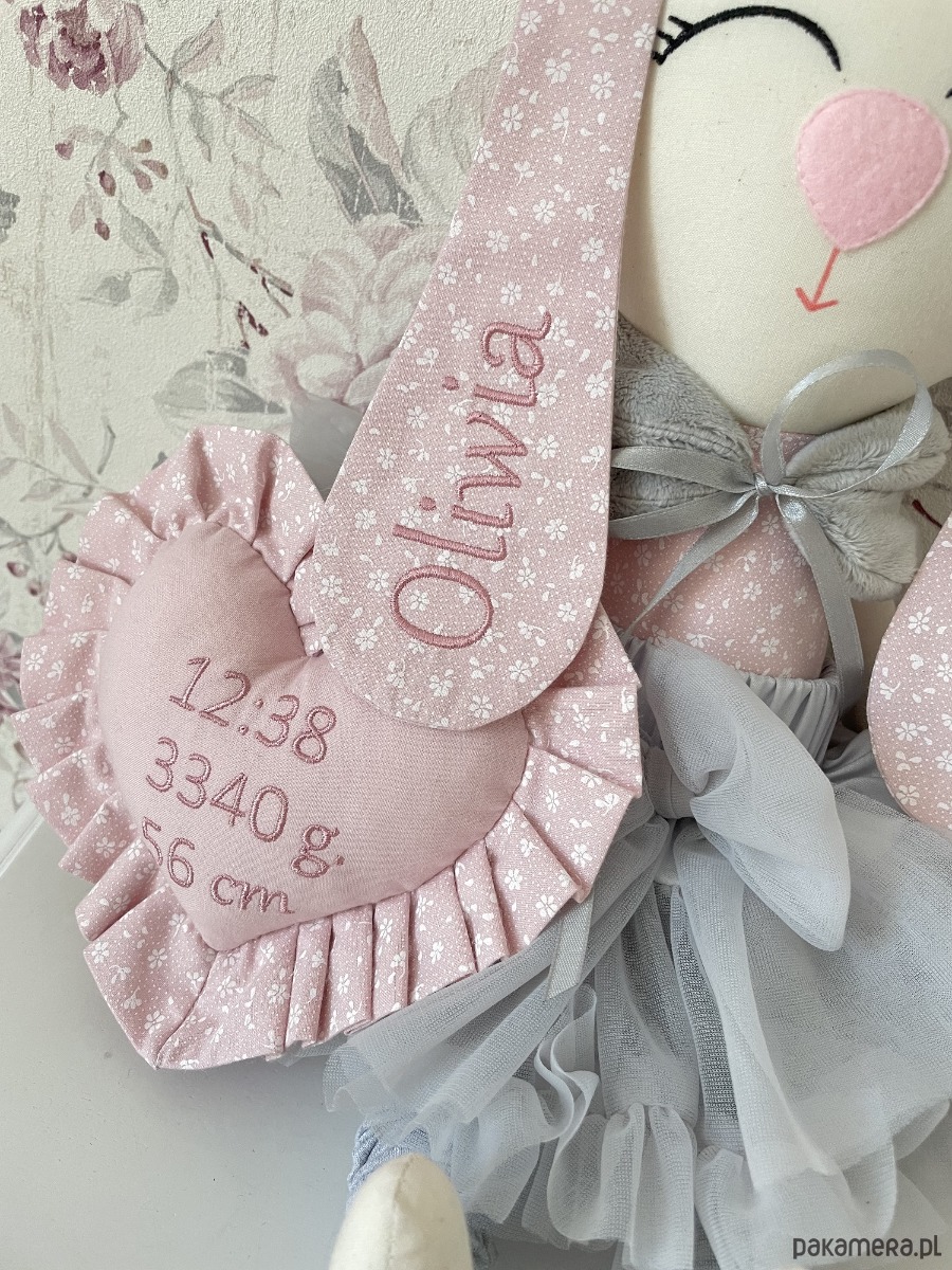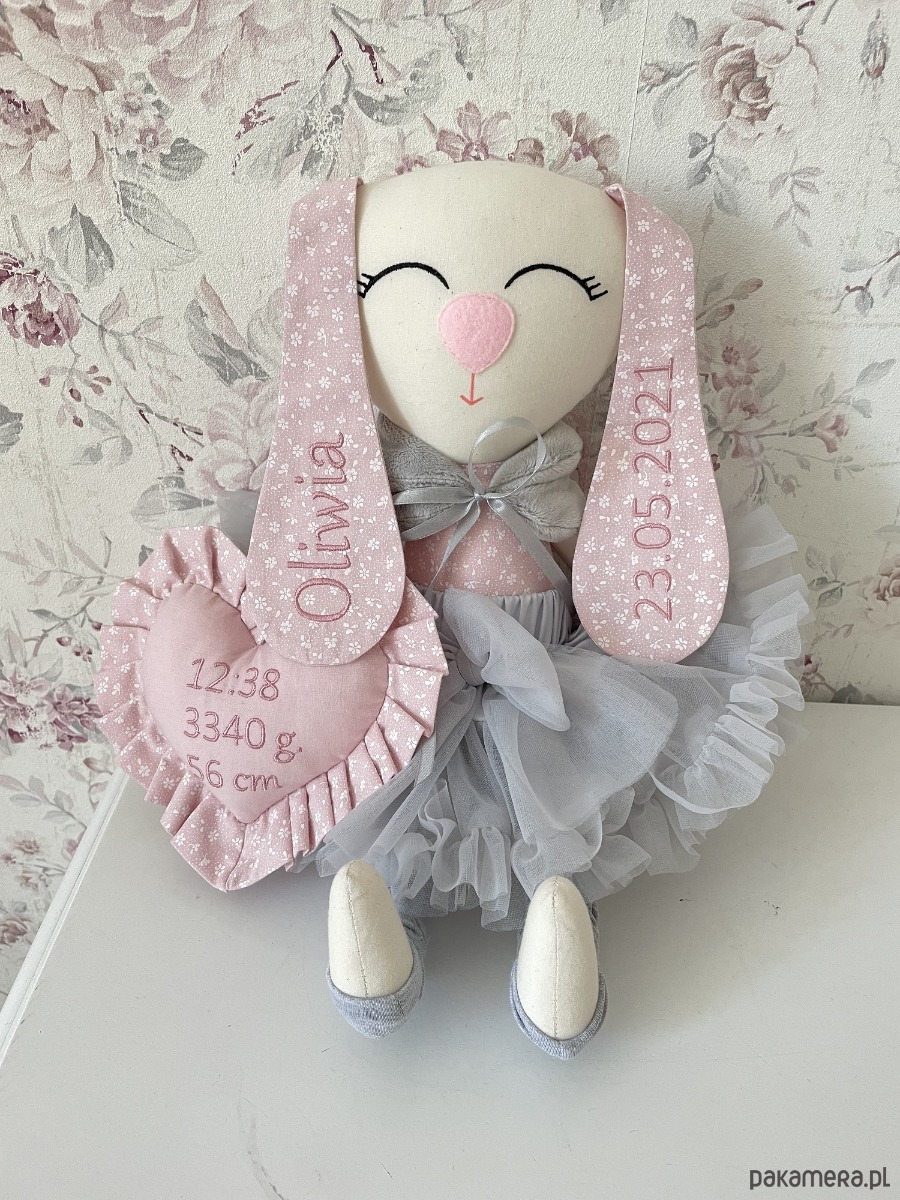 Dodatkowo króliczek ma dołączone serduszko do rączki z informacjami na temat narodzin. Króliczek będzie idealną pamiątką z okazji narodzin Maleństwa.