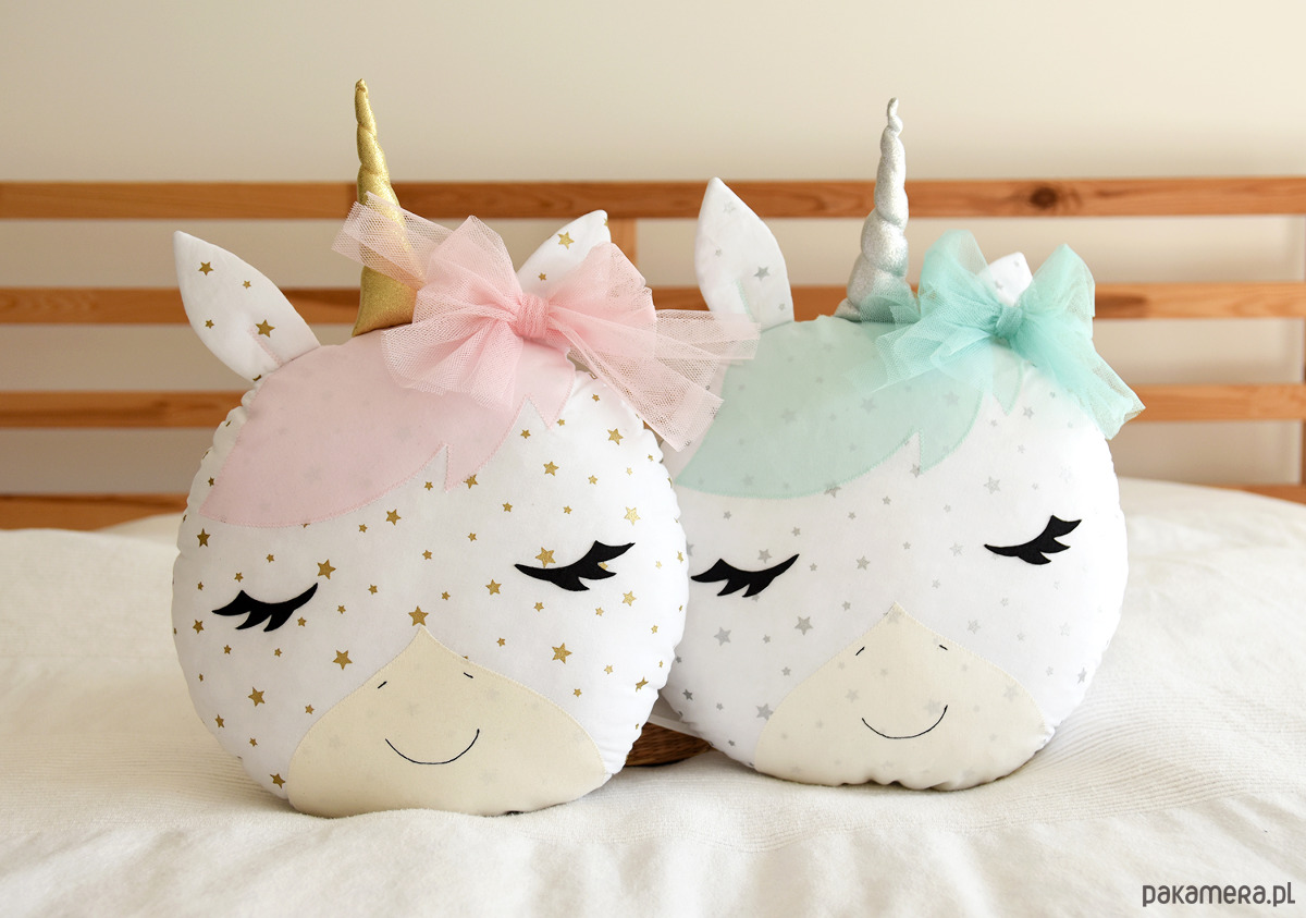 Poduszka w kształcie jednorożca uszyta z bawełnianych tkanin, tiulu oraz filcu. Całość solidnie wypełniona antyalergiczną kulką silikonową.