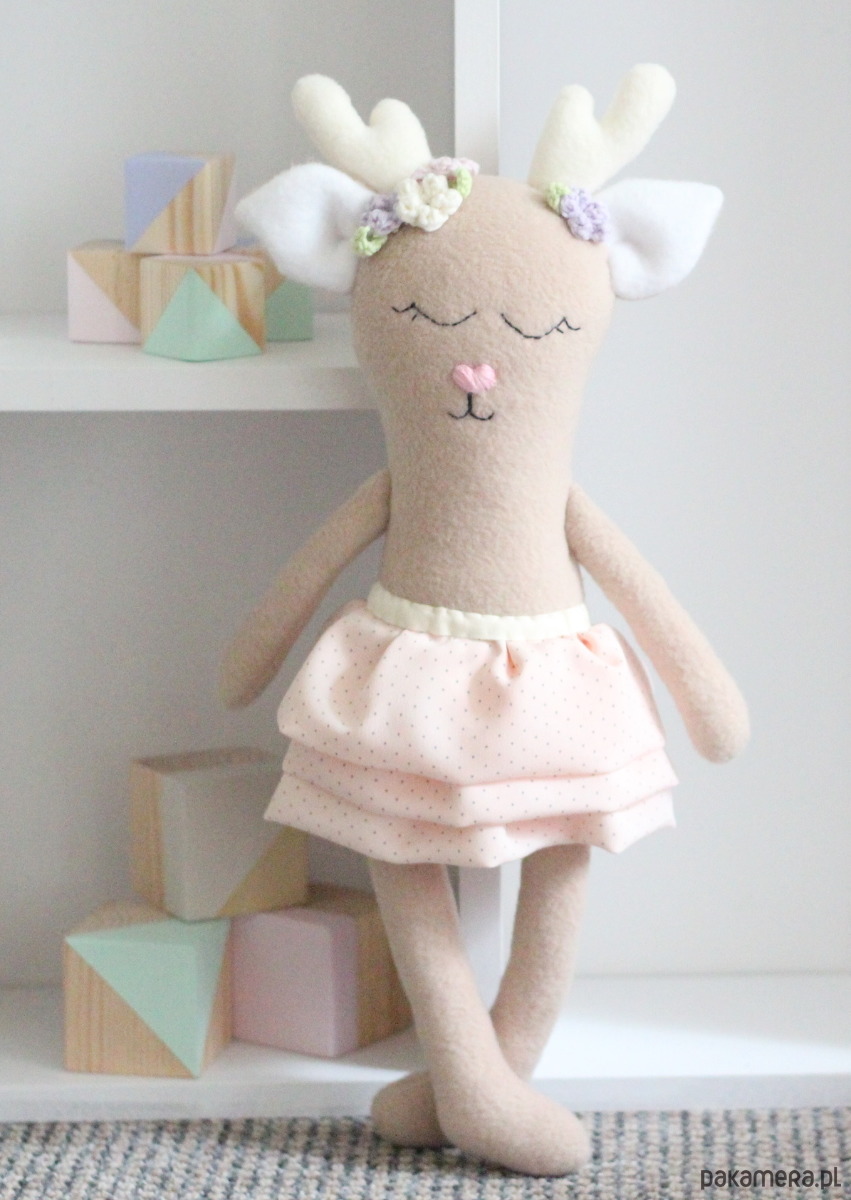 Jelonek Zuzia ma 40cm wzrostu, falbaniastą spódniczkę i kwiaty we włosach.