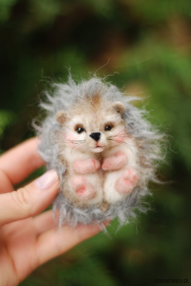 Mały jeżyk, wykonany metodą filcowania na sucho z wełny merynos.