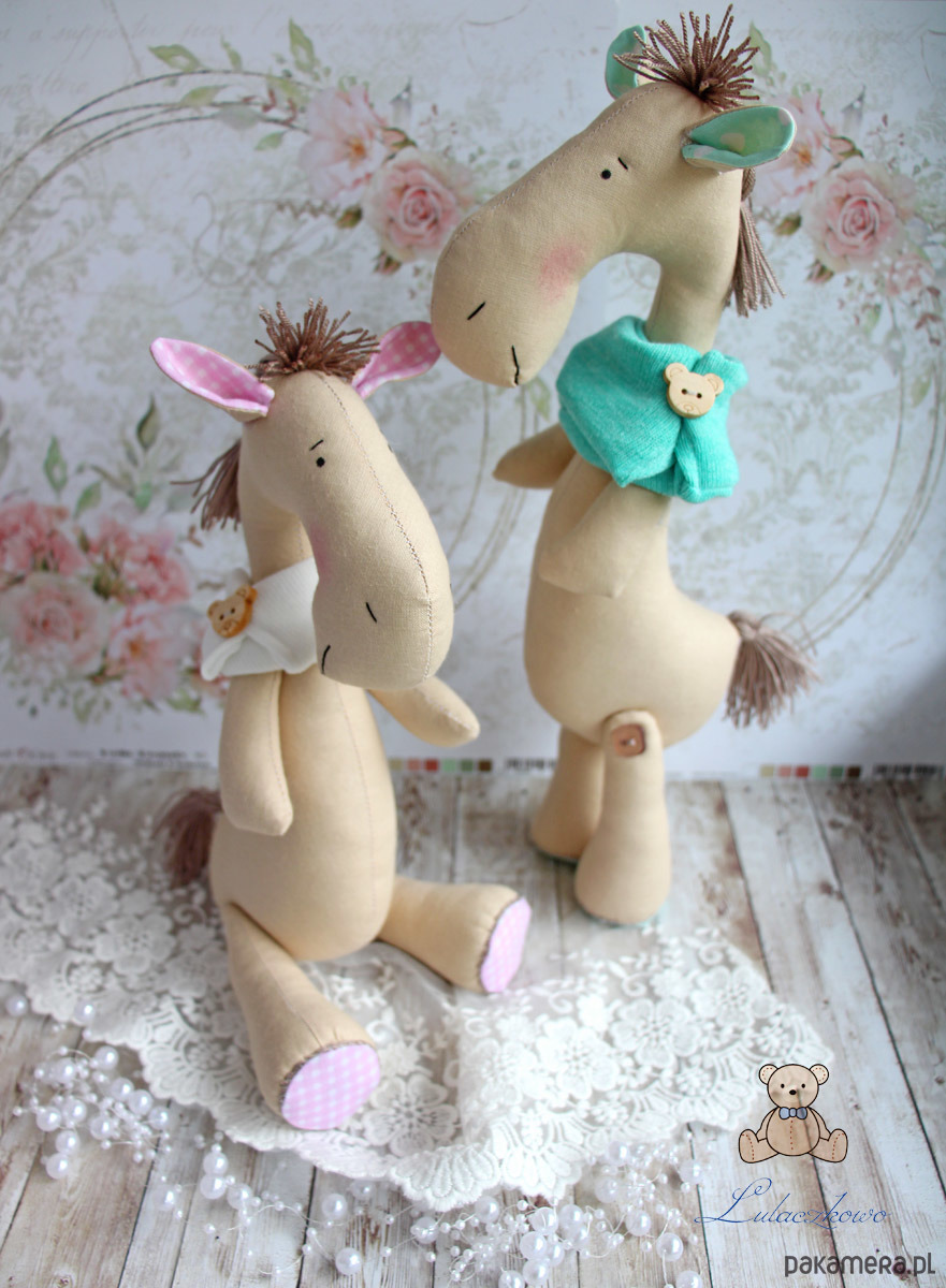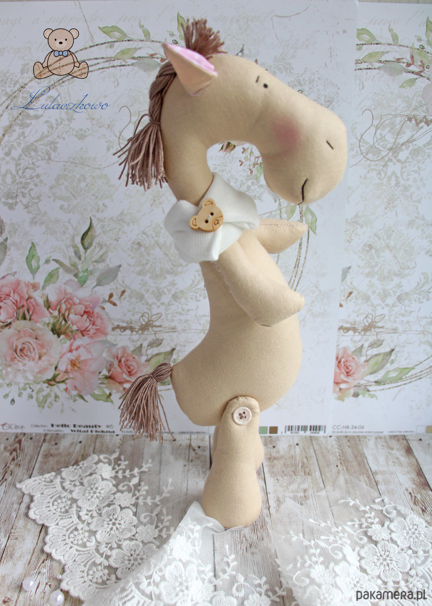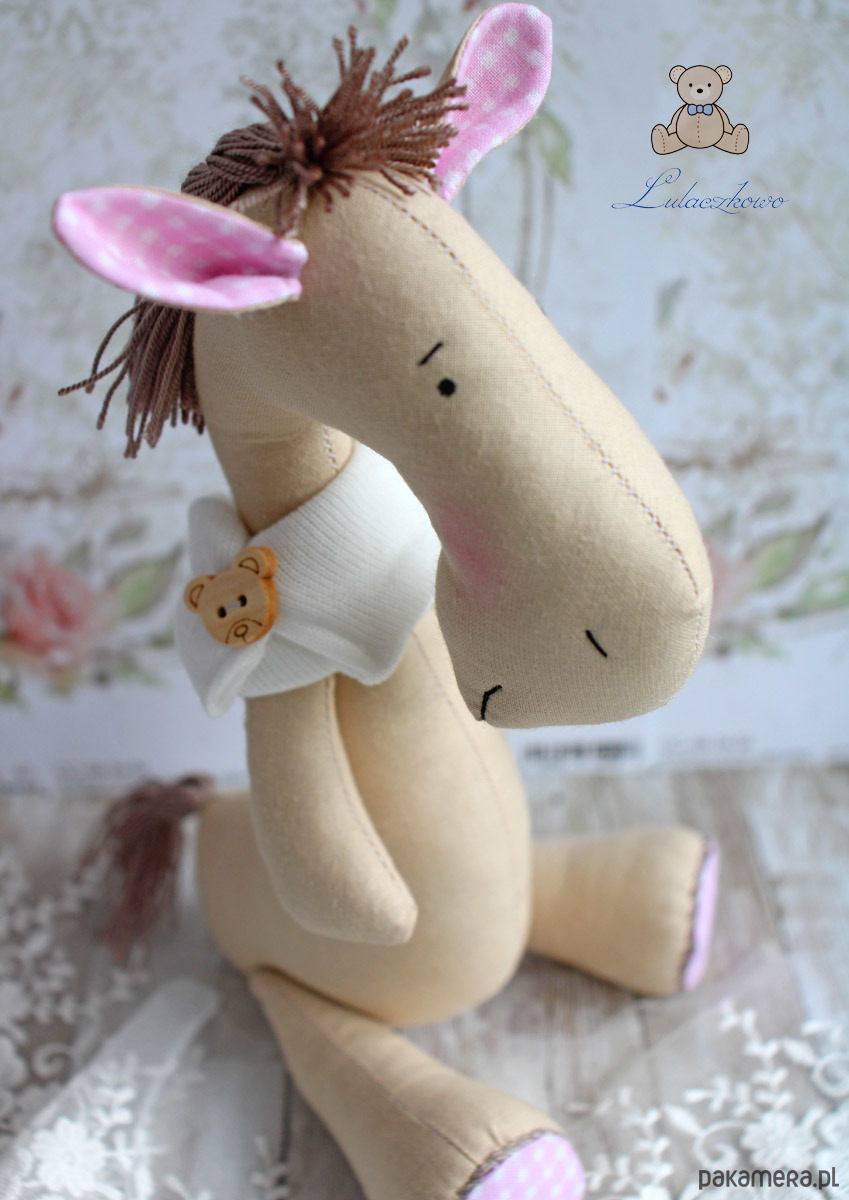 Przeuroczy konik w stylu Tilda, uszyty ręcznie z dbałością o każdy szczegół. Konik wykonany z tkaniny bawełnianej, wypełniony antyalergiczną kulką silikonową, oczka malowane wodoodpornym markerem, nosek, brwi i usta wyszyte czarną nicią. Grzywa i ogon wykonane z brązowej włóczki, przednie i tylne łapki ruchome, konik po odpowiednim ustawieniu samodzielnie siedzi. Ubrany w fantazyjny szaliczek/komin z ozdobnym misiowym guziczkiem.