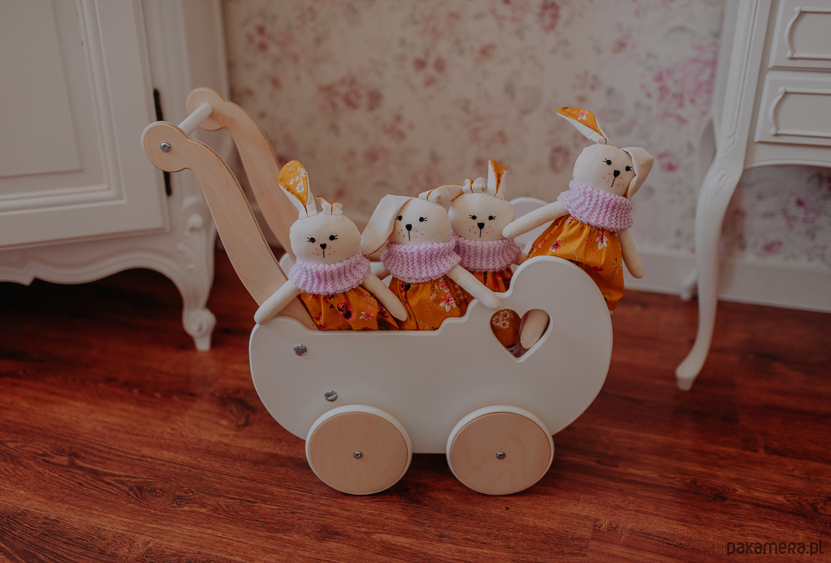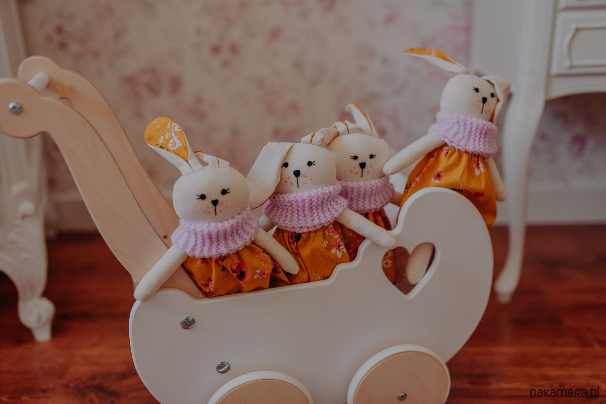 Słodkie króliczki wyróżniają się wyjątkowym ubrankiem. Ich ciałko zdobi bawełniana sukienka wykończona białą koronką. Szyję zdobi duży komin wykonany na szydełku. Buźka maskotki jest ręcznie wyhaftowana.