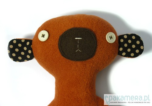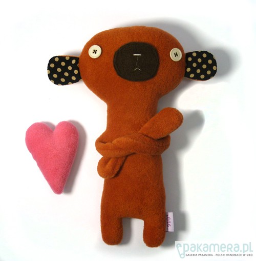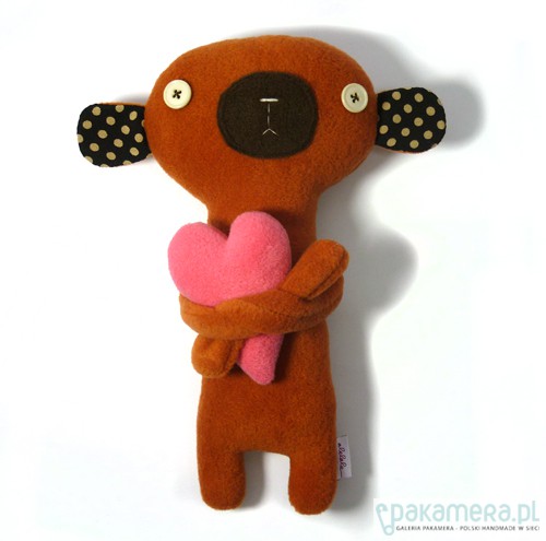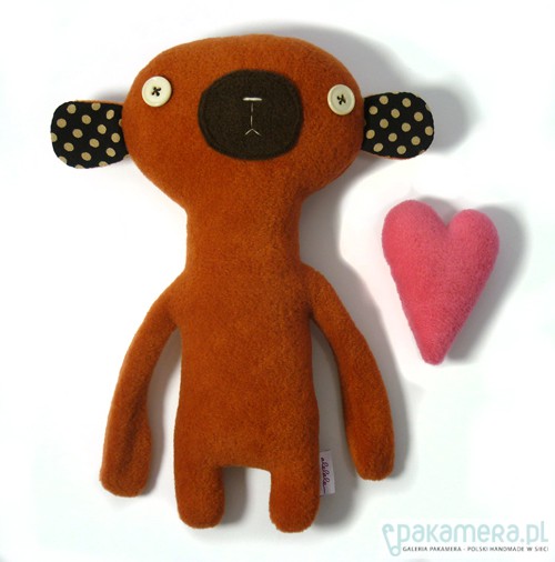 Miękki miś uszyty z polaru i bawełny. Oczy z guzików. Wypchany puszystą antyalergiczną włókniną. W komplecie z miękkim serduszkiem. Wymiary Misia: wys.26 cm, szer.13 cm + serdzuszko: 9 cm