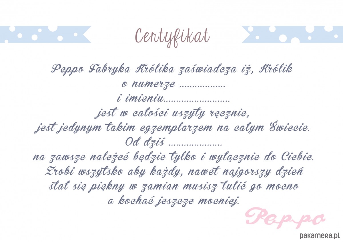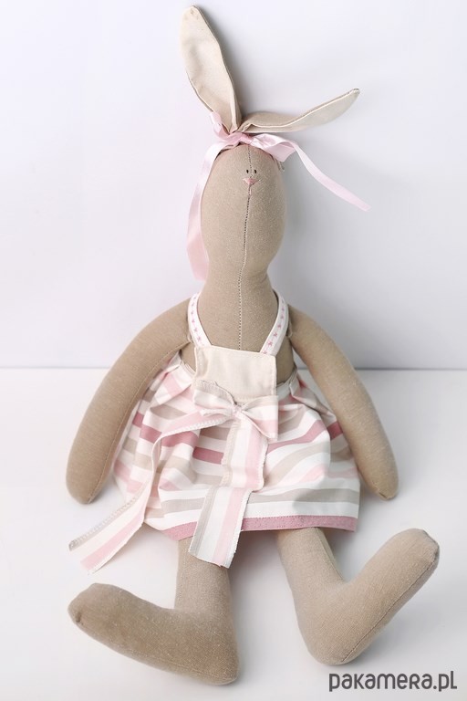 Nazywam się Pani Królik. Jestem przytulanką. Lubią mnie mali ale potrafię wywołać uśmiech na twarzach tych dużych. Mam długie ręce aby Cię lepiej przytulać. Mam długie nogi aby pójść za Tobą wszędzie. Mam długie uszy aby słuchać Twoich piosenek, opowiadań i bajek na dobranoc. Mam miękki brzuszek aby tulić mnie każdego dnia. Jestem wysokim Szaraczkiem , mam prawie 50cm. To akurat , żeby zmieścić się w Twojej rączce. Jestem mięciutka i antyalergiczna. Obiecuję, że każdy nawet najgorszy dzień stanie się piękny i słoneczny, musisz mnie tylko tulić mocno a kochać jeszcze mocniej.