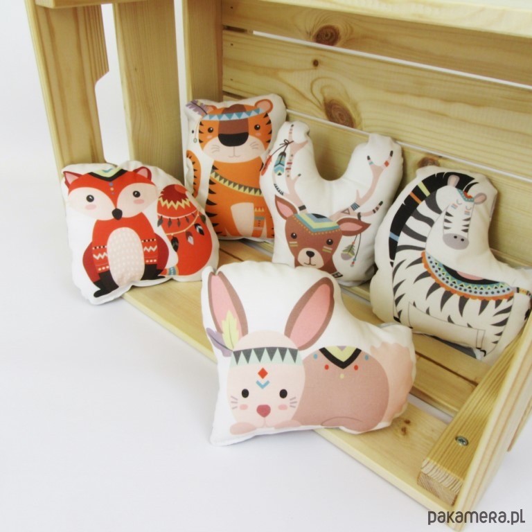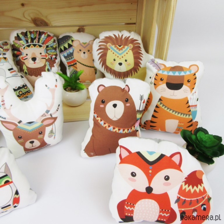 Duży zestaw pięknych poduszeczek - maskotek. Nadruk indiańskich zwierzątek jest ponadczasowy i zawsze aktualny.