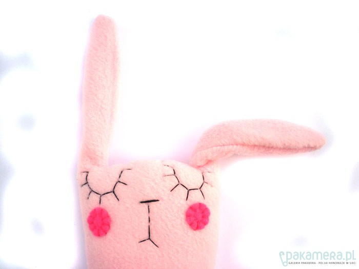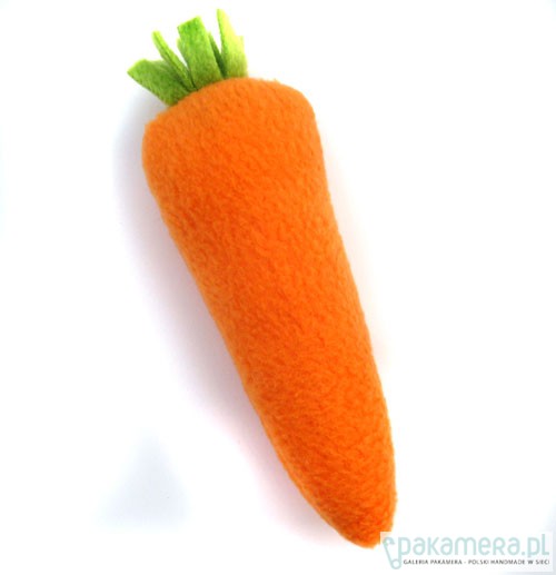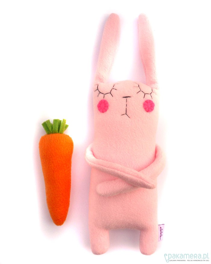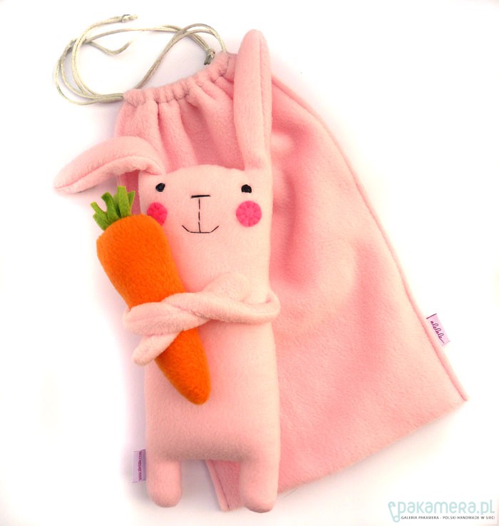 Dwustronny miękki zajączek w komplecie z marchewką/grzechotką i woreczkiem. Zając ma 34 cm wzrostu (razem z uszami). W środku włóknina antyalergiczna. Zajączka najlepiej prać ręcznie (woreczek i marchewkę można w pralce).