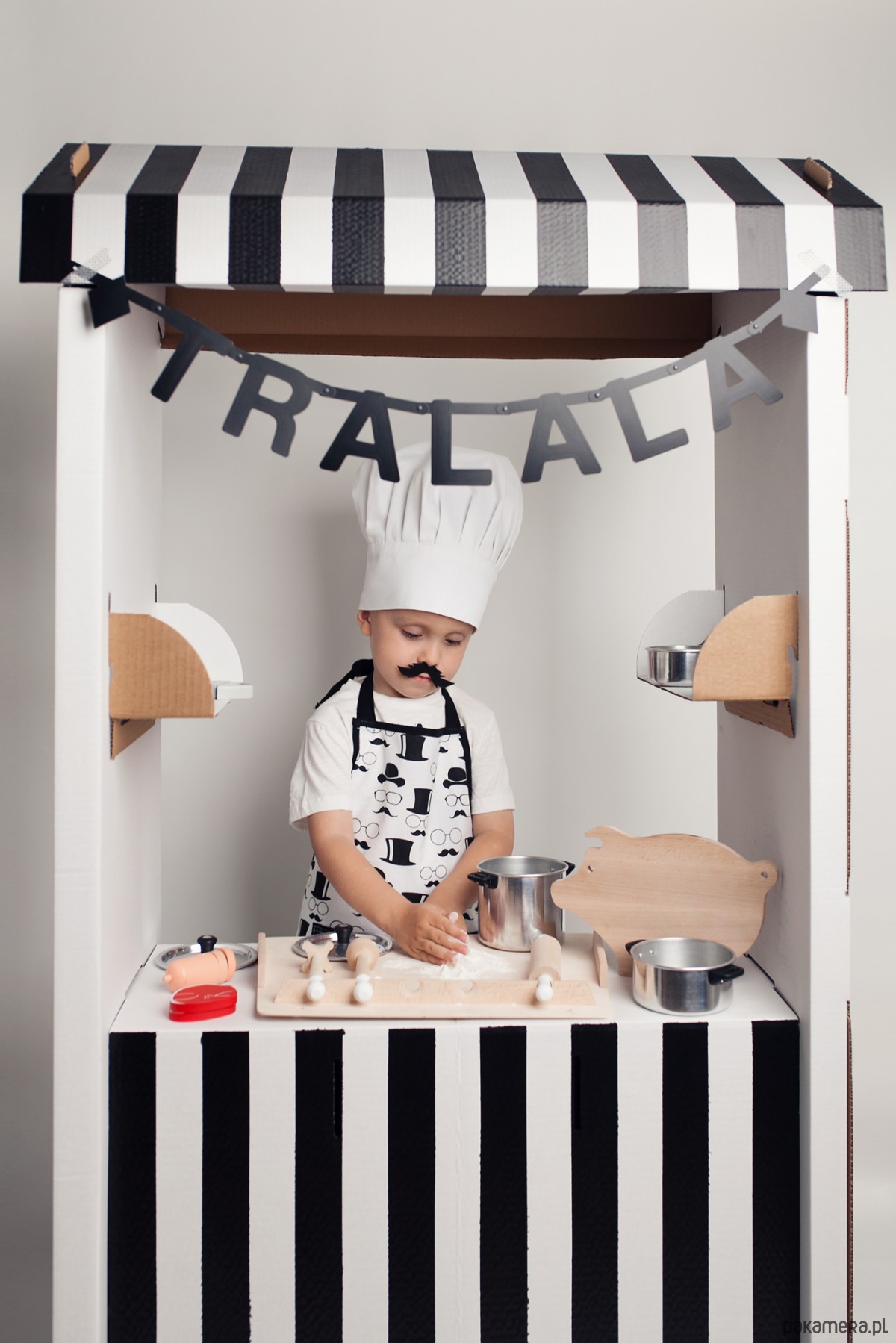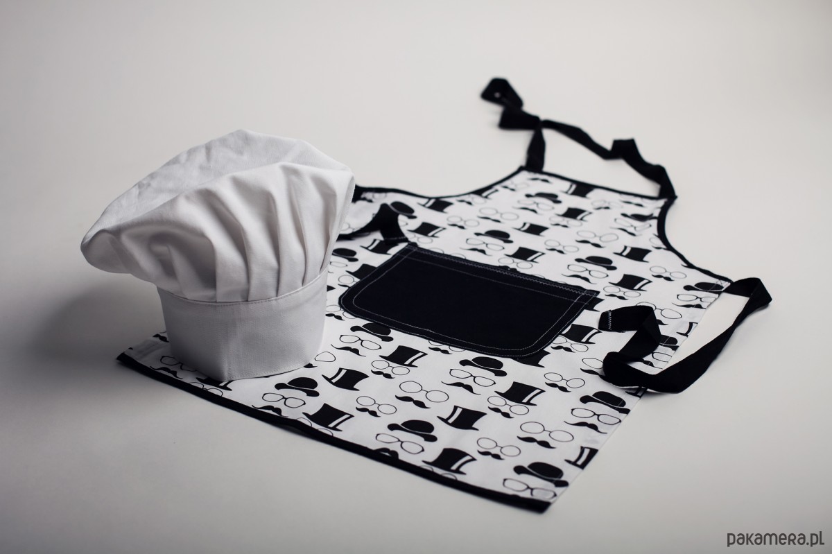 Niebanalny fartuszek w zestawie z czapą kucharską. Idealny komplet dla małego miłośnika gotowania.