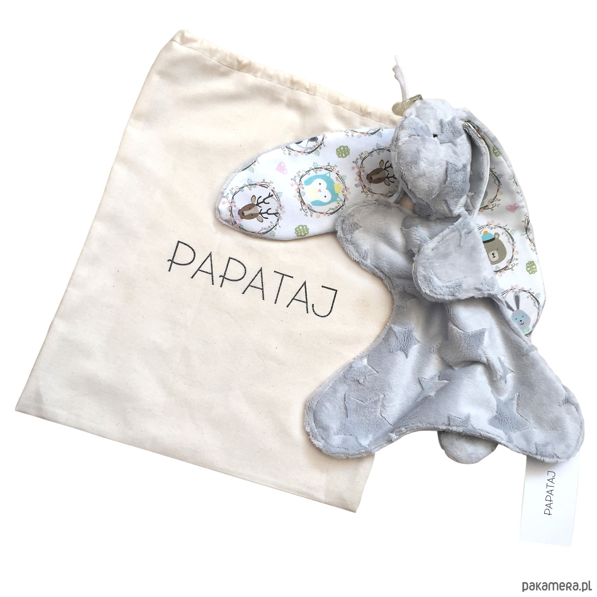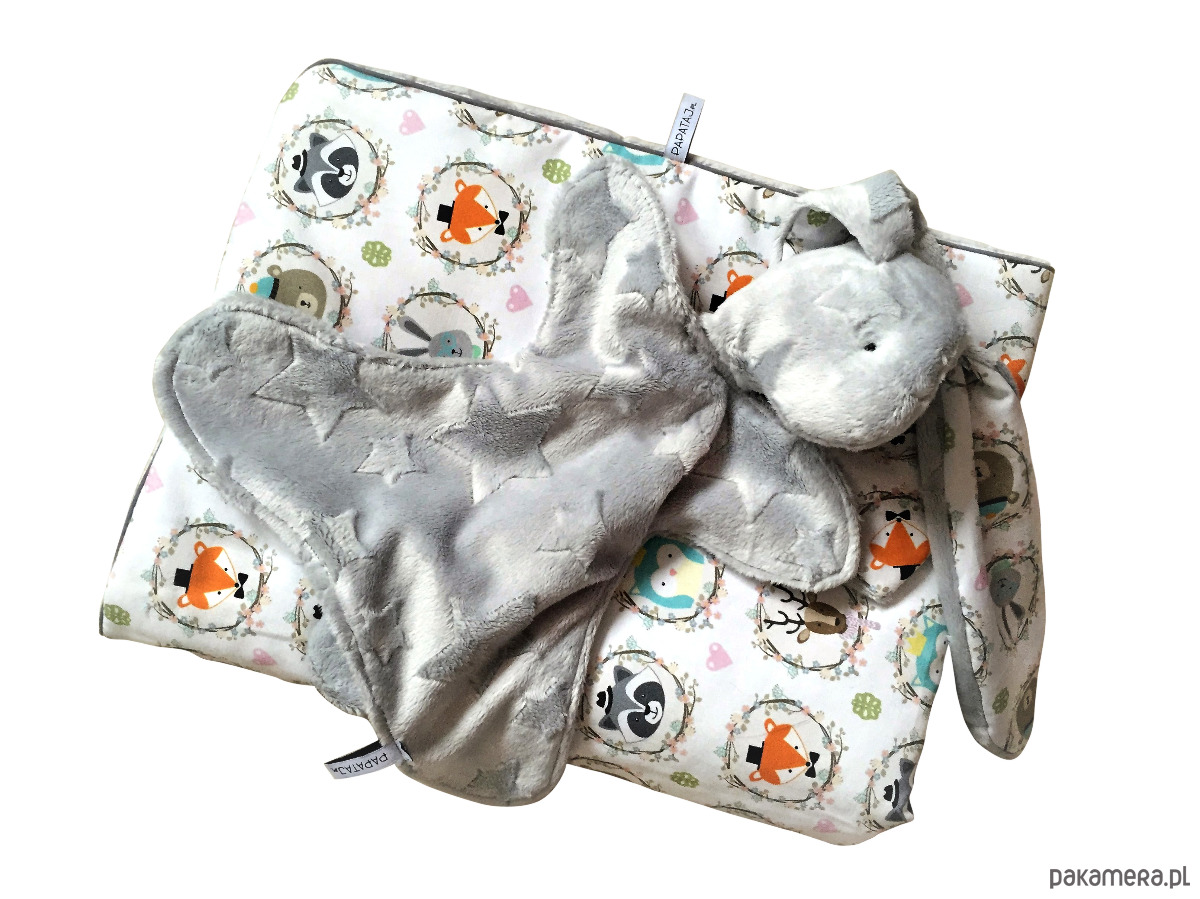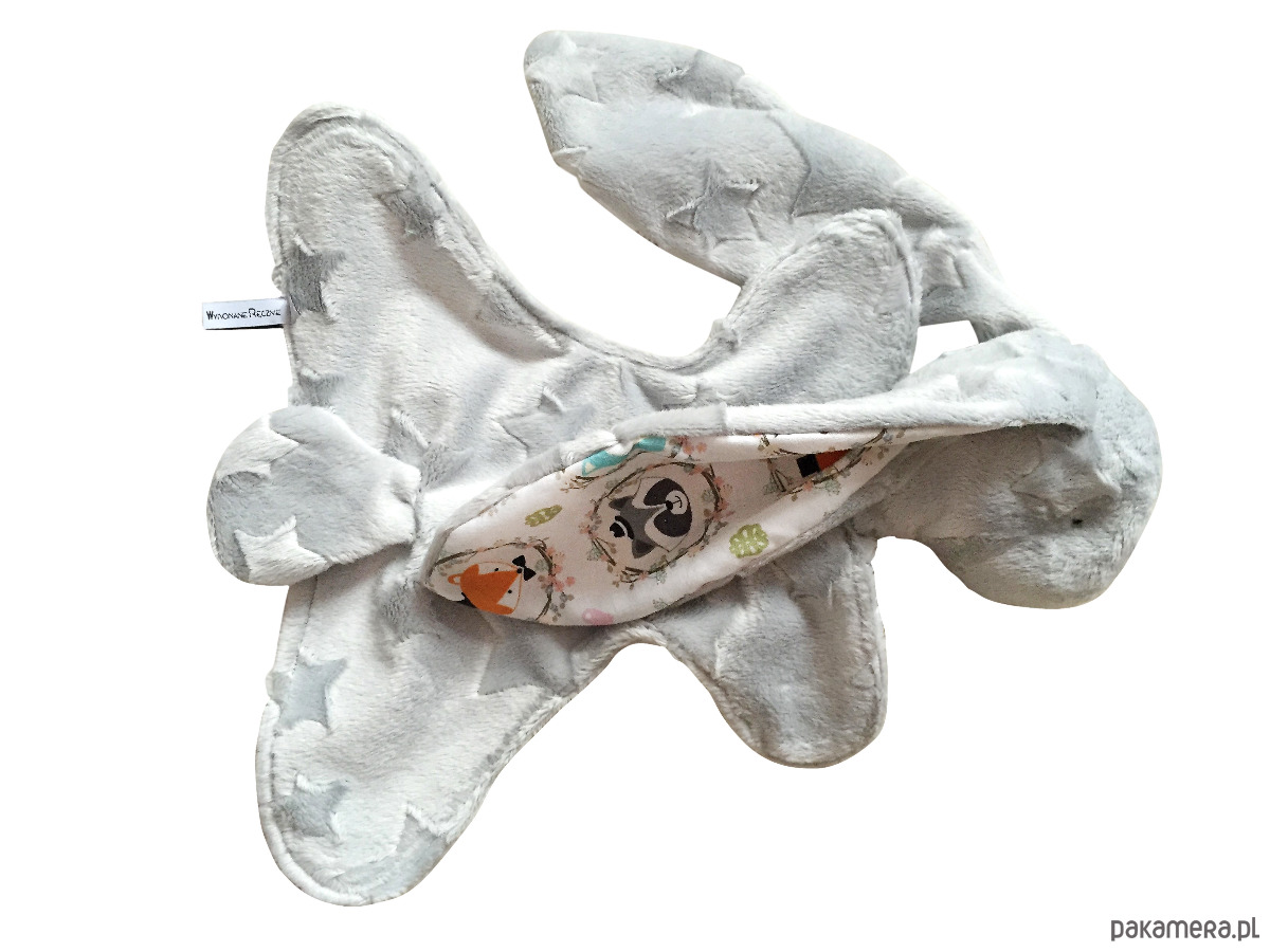 Przytulanka dla najmłodszych. Miękka z plushu minky, w uszy wszyty materiał bawłeniany.Można dobrać materiał do kocyka czy kołderki żeby tworzyły zestaw.