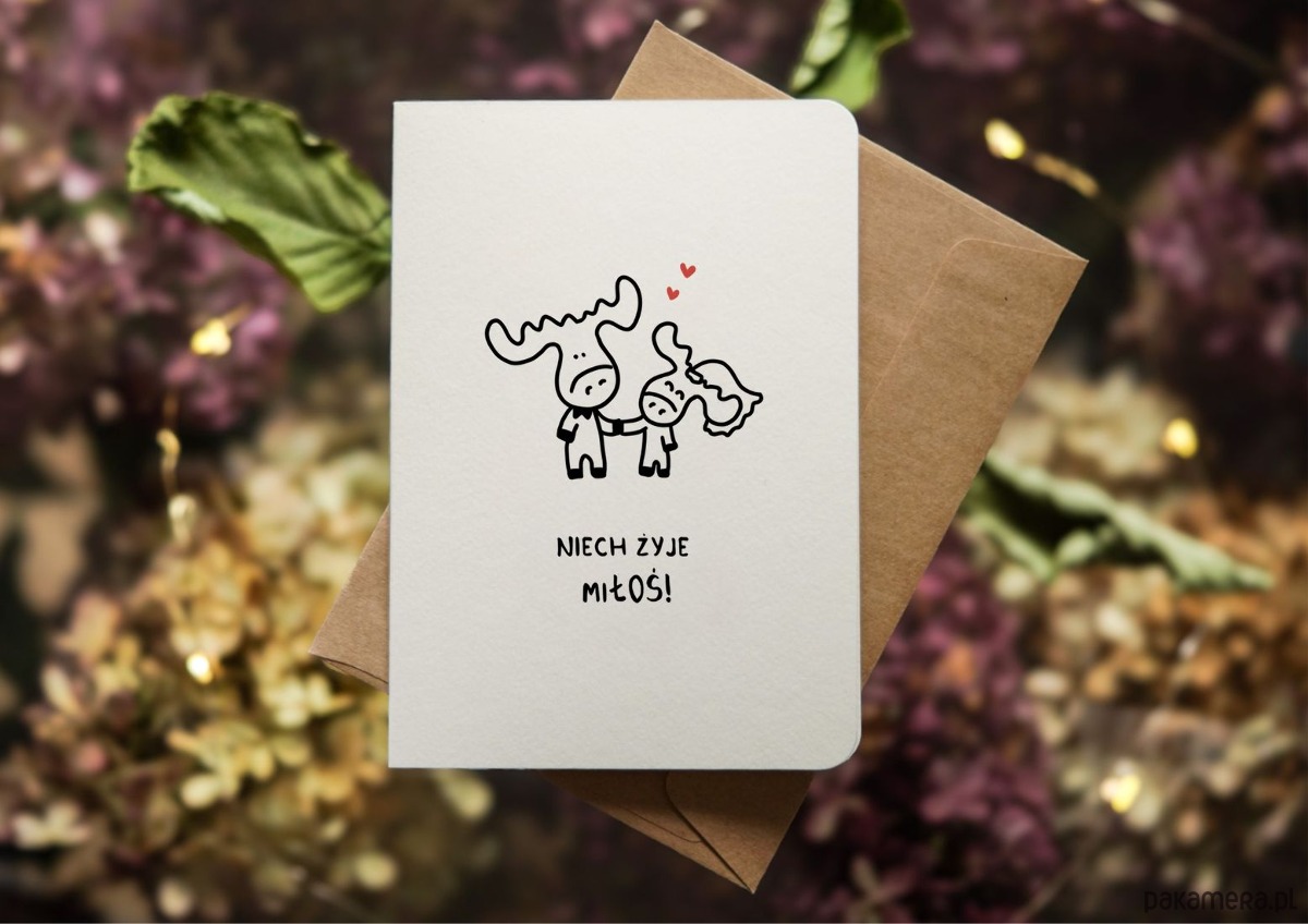 Zabawna kartka ślubna Niech żyje MiŁOŚ, oryginalna grafika, minimalistyczna