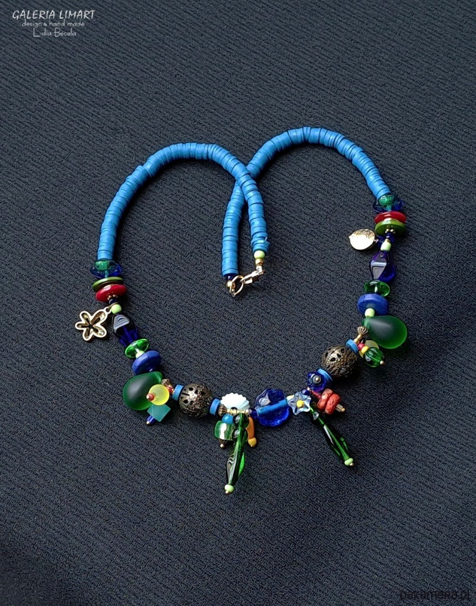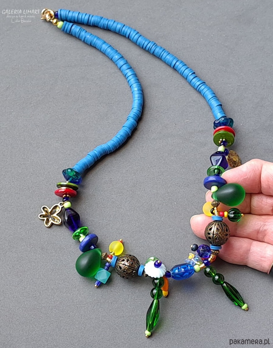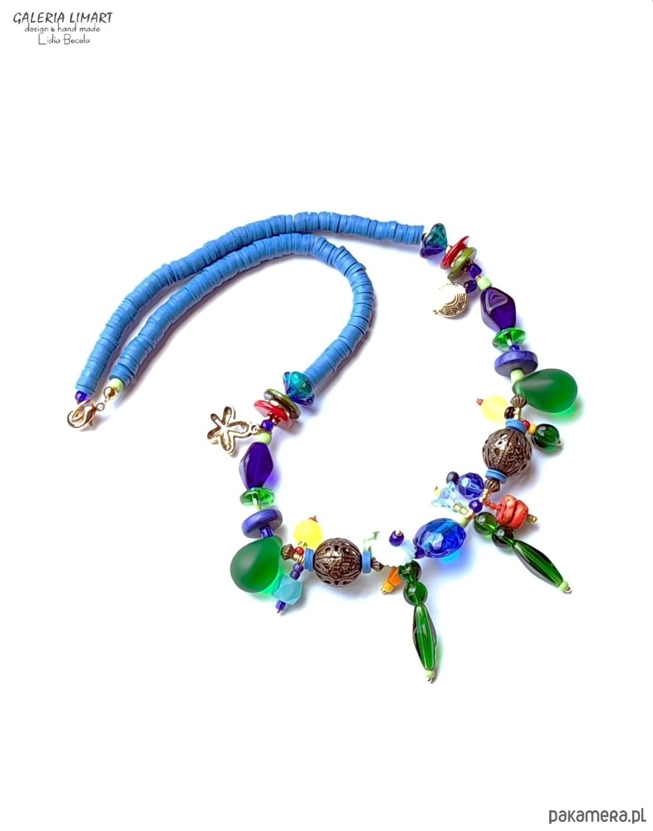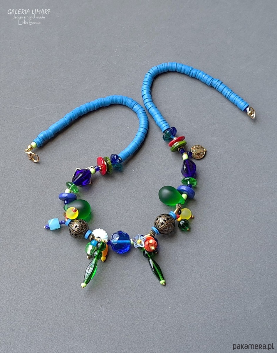 To uroczy, ogromnie kolorowy i spektakularny, bardzo wyrazisty i efektowny naszyjnik, to kobieca, niecodzienna, utrzymana w duchu bohemy artystycznej ozdoba. Lekki. Taki OPTYMISTYCZNY naszyjnik na rozjaśnienie ponurej aury.