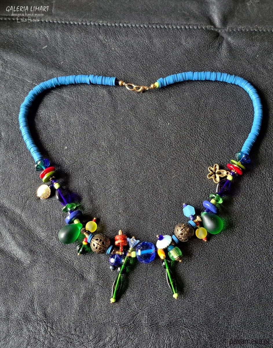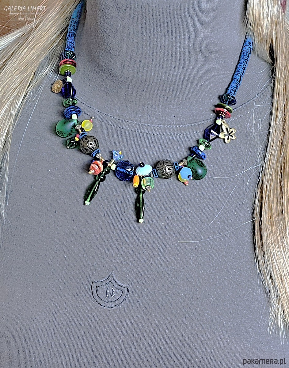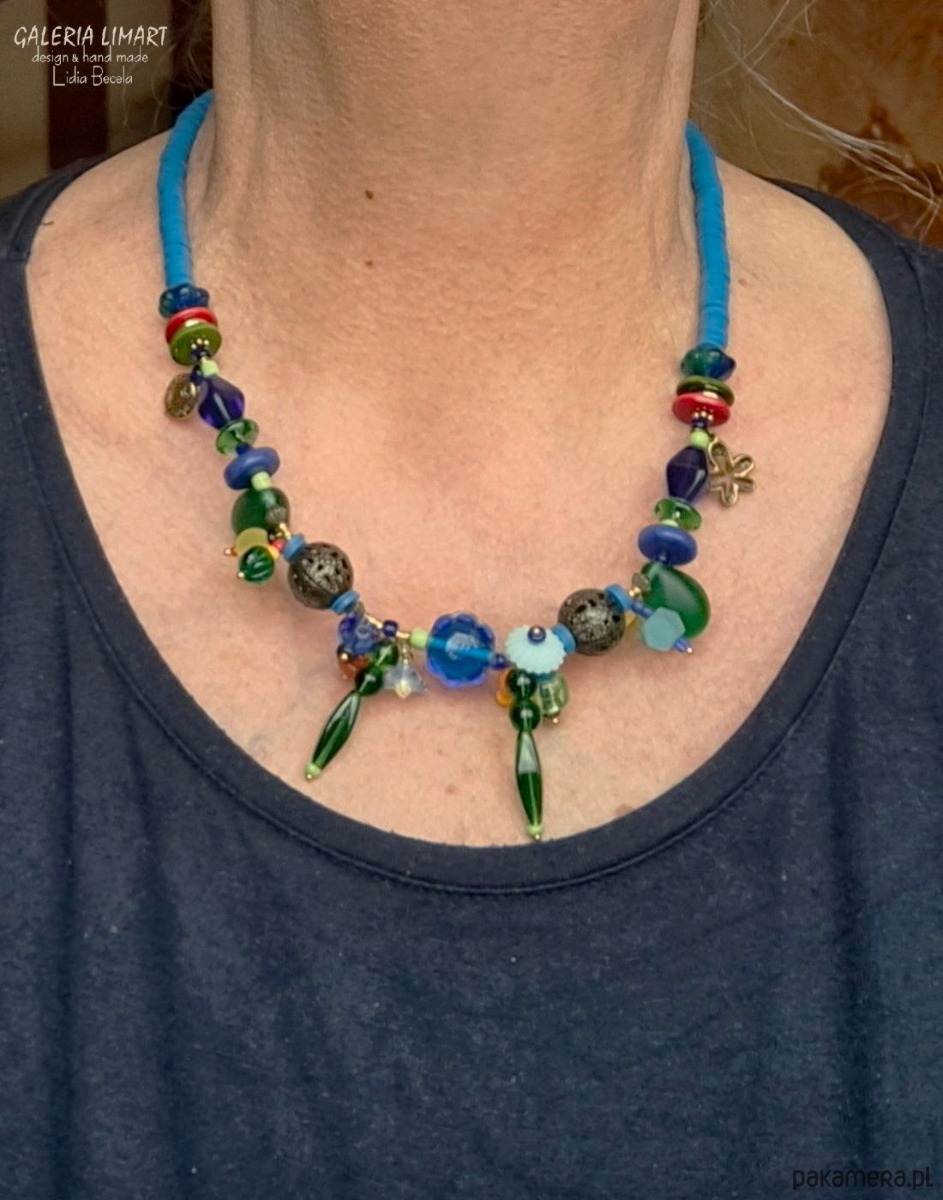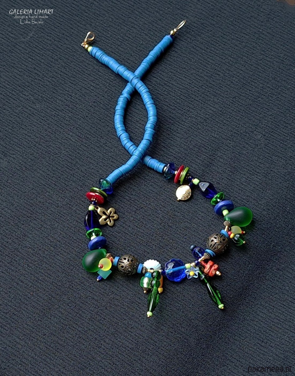 To uroczy, ogromnie kolorowy i spektakularny, bardzo wyrazisty i efektowny naszyjnik, to kobieca, niecodzienna, utrzymana w duchu bohemy artystycznej ozdoba. Lekki. Taki OPTYMISTYCZNY naszyjnik na rozjaśnienie ponurej aury.