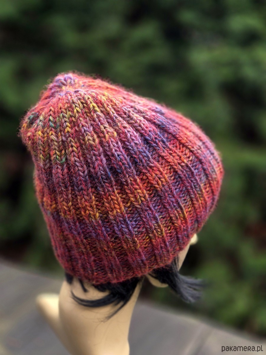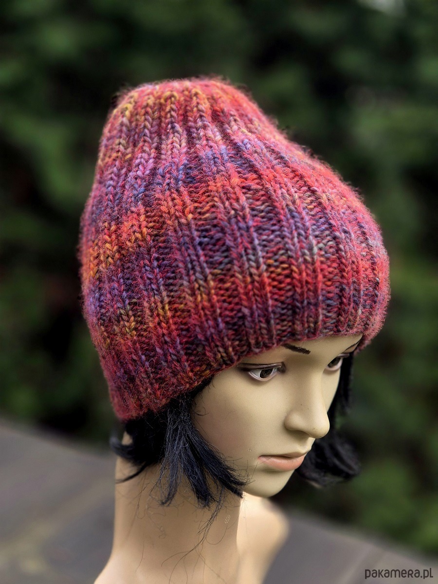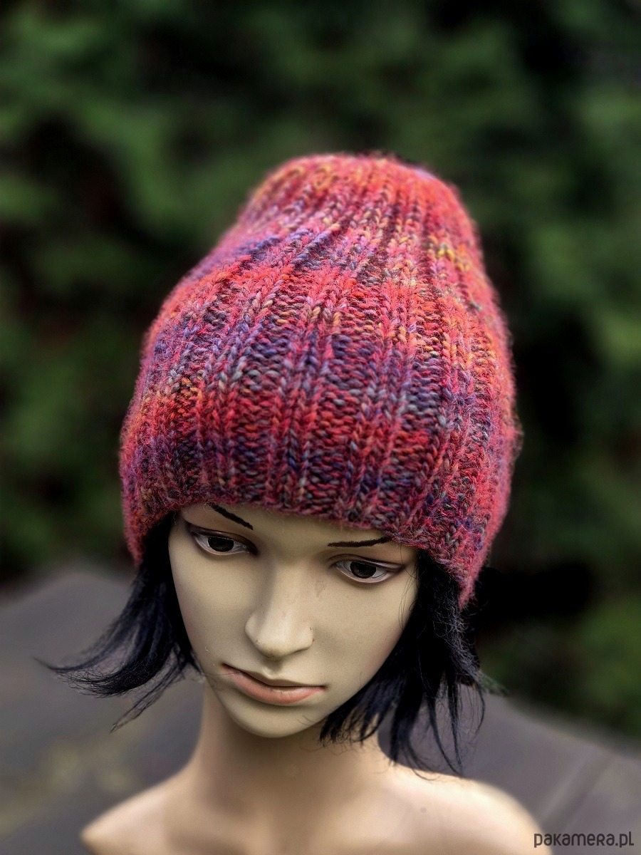 Ciepła, mięsista, miękka i cudowna w dotyku czapka wykonana ręcznie na drutach. Połączyłam cieniutką nitkę 75% kid moher/25% jedwab z włoską kolorową włóczka (50% wełna dziewicza, 50% poliakryl). Czapka bezszwowa, świetnie dopasowuje się do głowy.