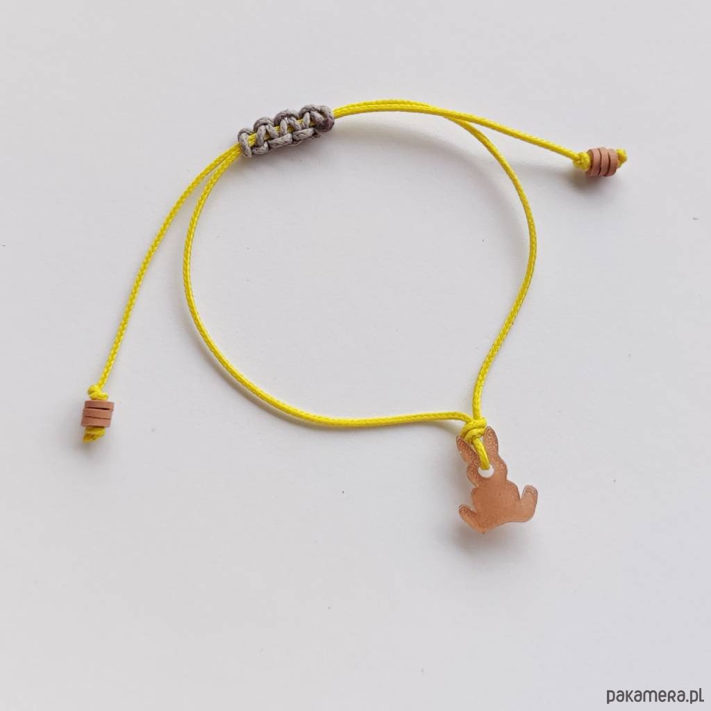 ZAJĄC bransoletka- zabawny dodatek. Ciekawy dodatek przykuwają uwagę i zaskakuje wzornictwem. Taka bransoletka sprawi, że każda stylizacja nabierze niepowtarzalnego, fantazyjnego charakteru. Bransoletka wykonana jest z: tworzywo sztuczne,koraliki Katsuki (średnicy 4mm), ozdobny sznurek.Długość zawieszki 1,5 cm. Szeroko - 1,3 cm.