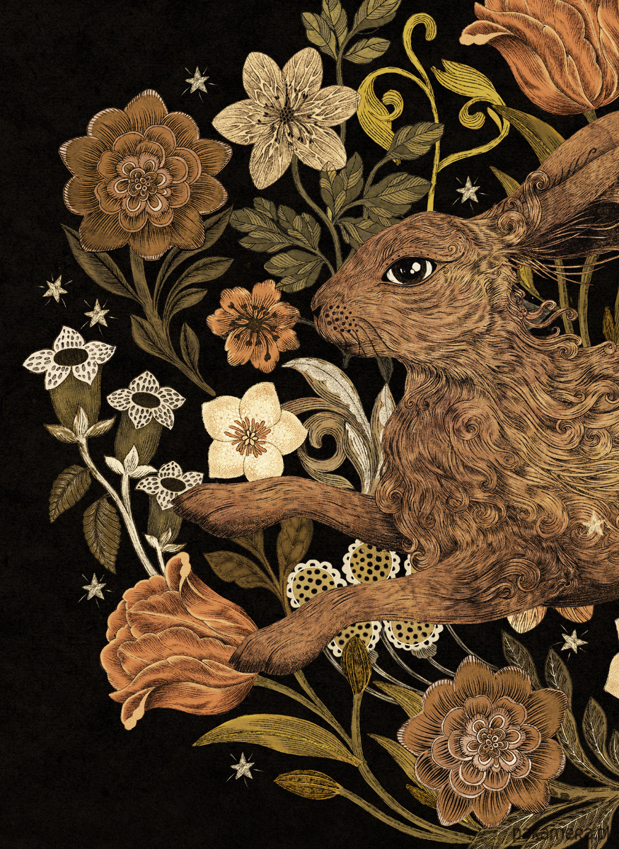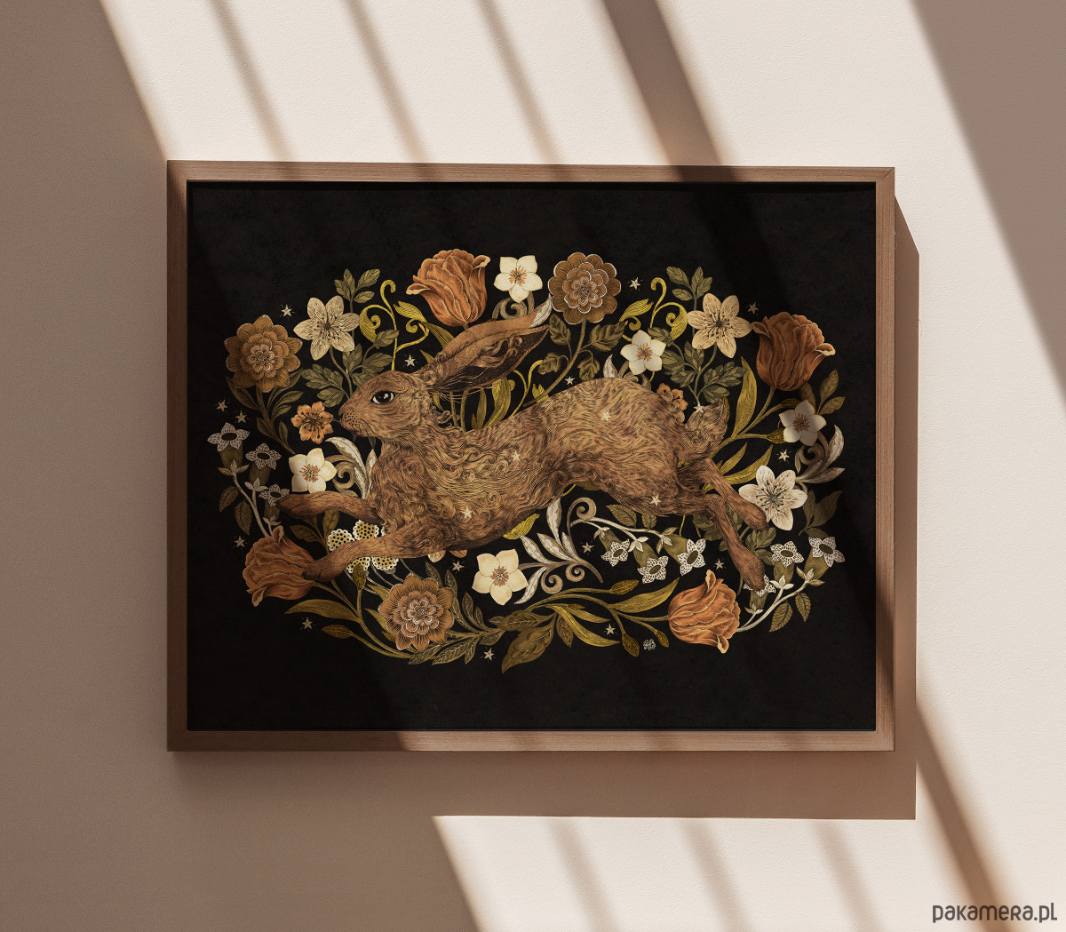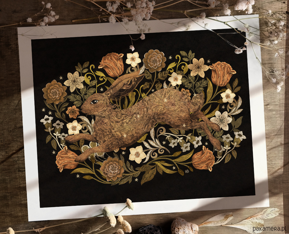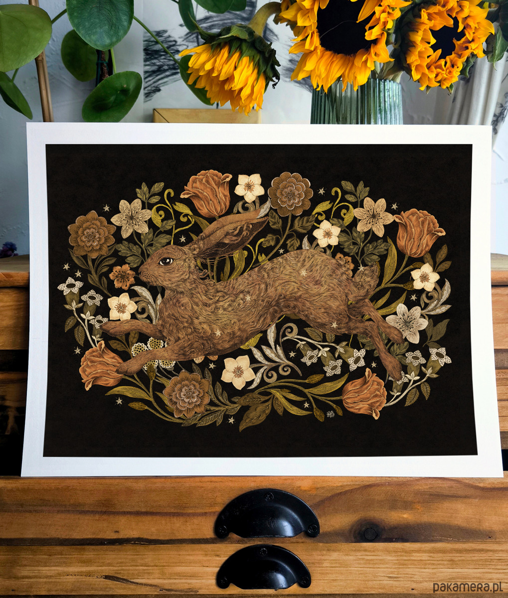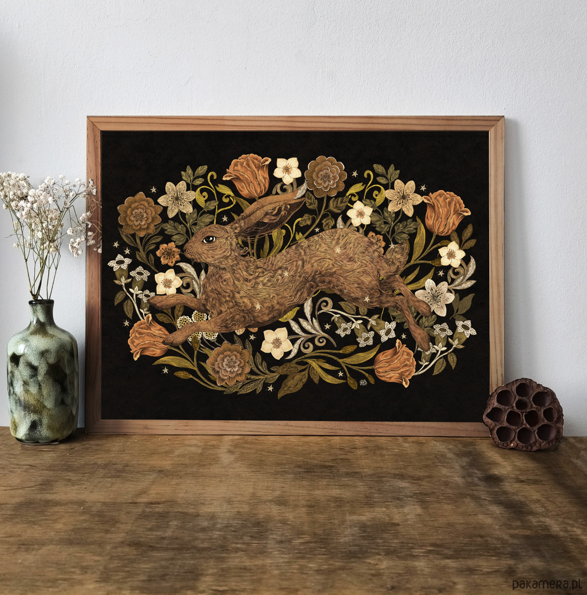 Zając i dzikie kwiaty, plakat botaniczny, plakat autorski, ilustracja