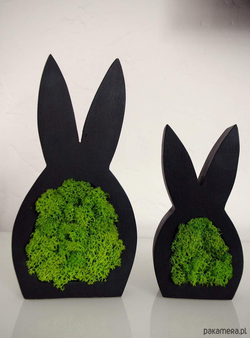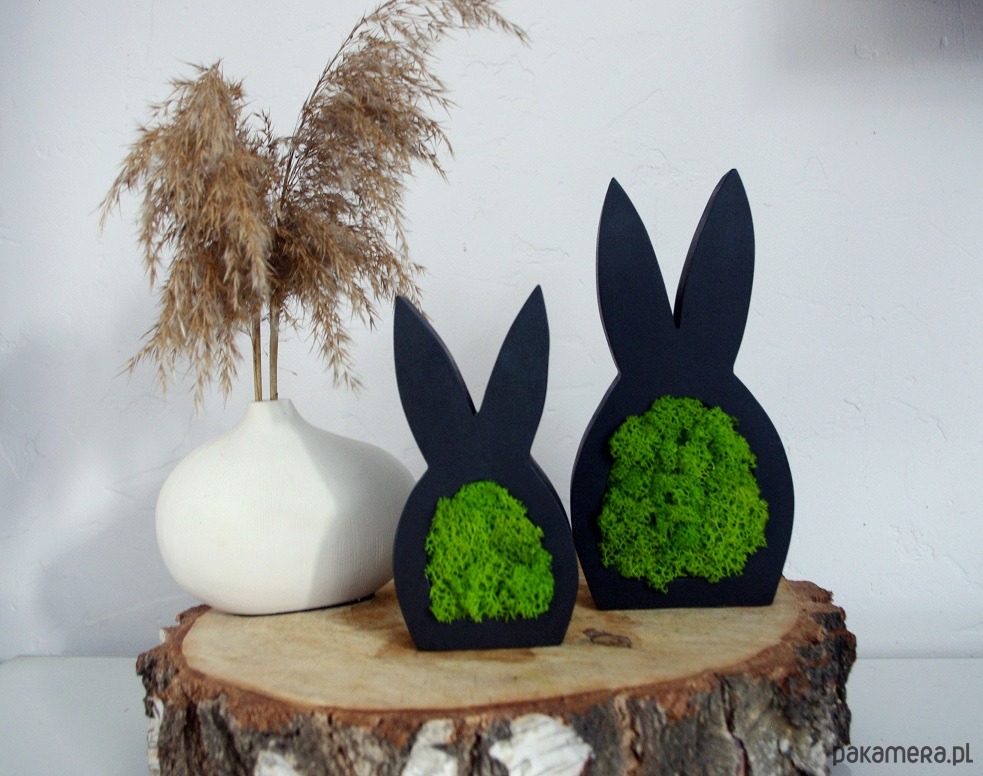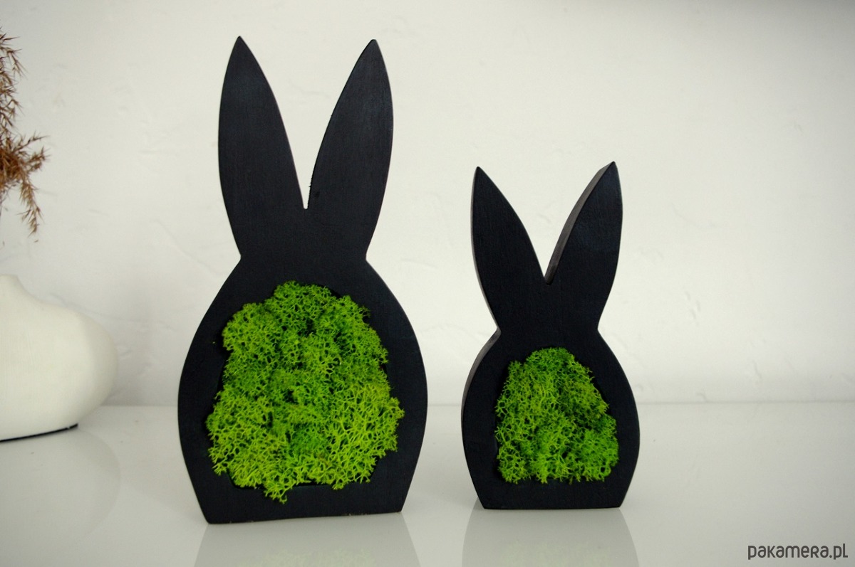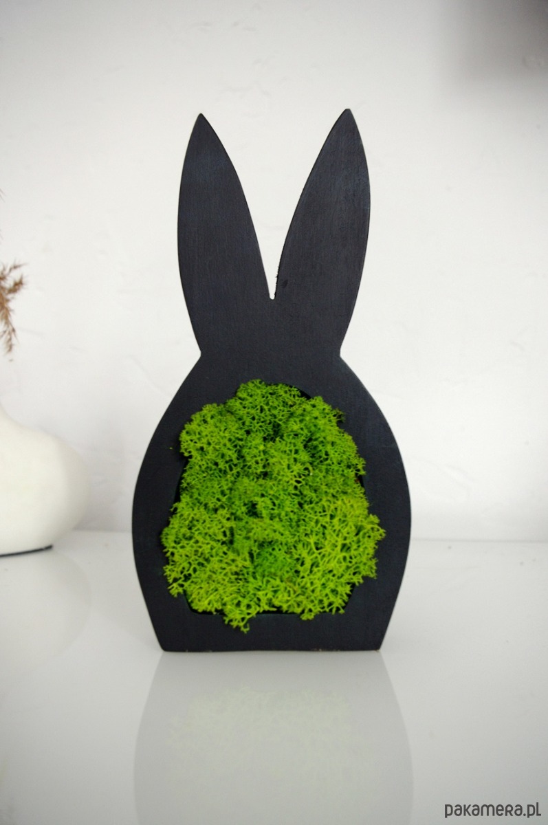 Zajączek jest wykonany z drewna, malowany na czarny mat, obustronnie wypełniony chrobotkiem.