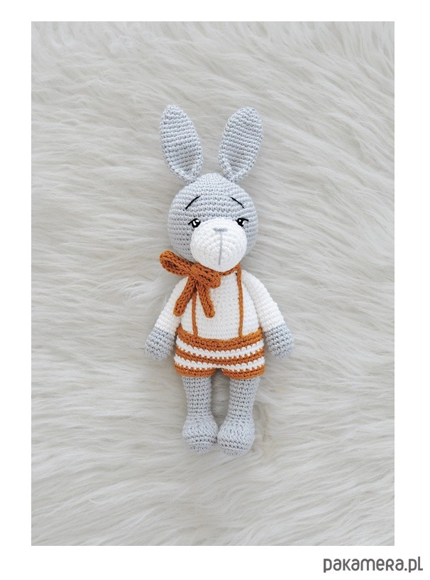 Ten uroczy zając ma ok. 25cm wzrostu i popielate umaszczenie. Został wykonany z bawełny, wypełnienie to puch antyalergiczny. Dodatkową ozdobą zająca są pasiaste spodenki (spodenki nie są zdejmowane) i kokardka przy szyi. Zając nie stoi samodzielnie. Oczy są haftowane.