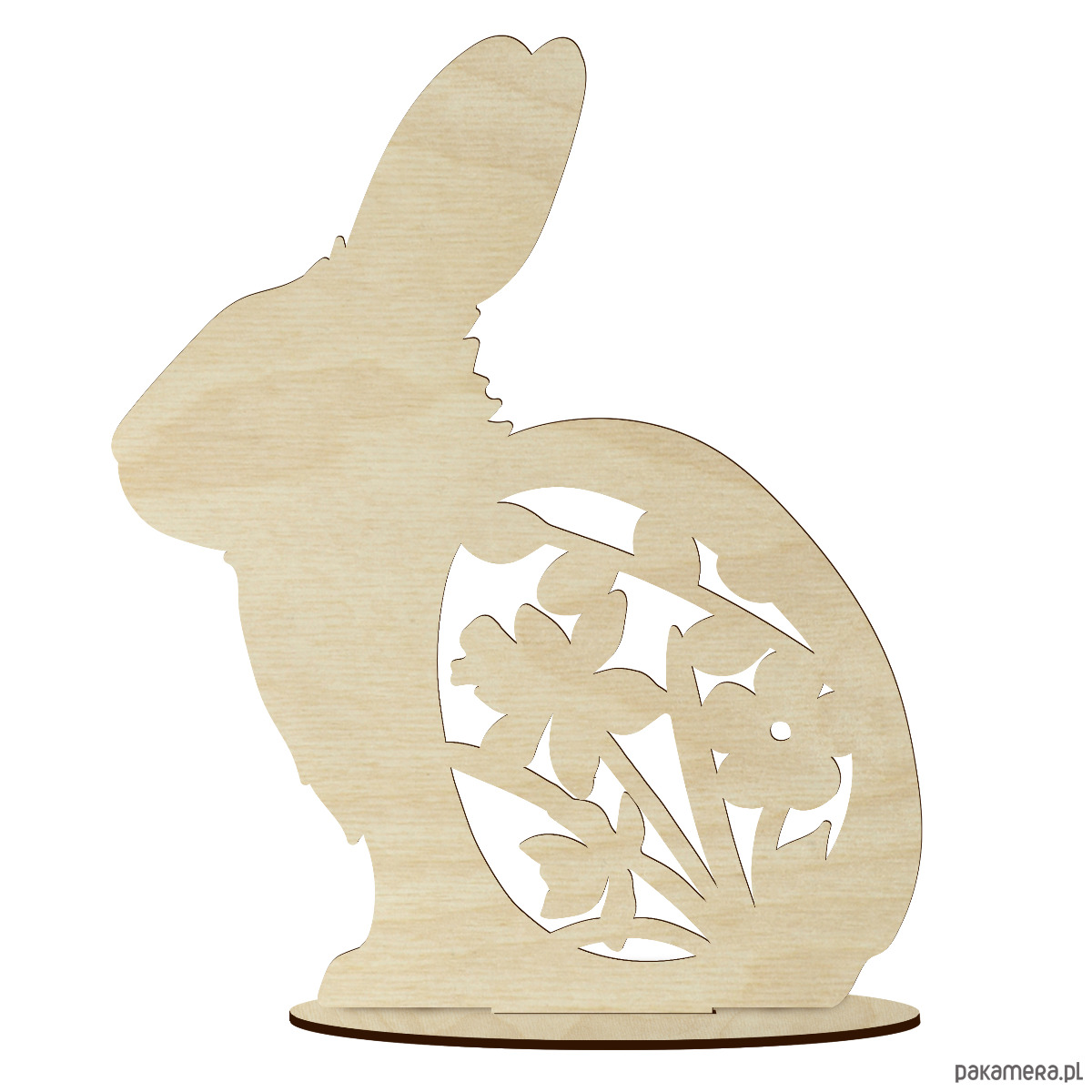 Uroczy drewniany zajączek wielkanocny na podstawce, wykonany z wysokiej jakości sklejki brzozowej. Idealny do malowania, kolorowania i personalizacji – świetnie sprawdzi się w koszyczkach, stroikach, dekoracjach świątecznych lub jako samodzielna ozdoba wielkanocna.