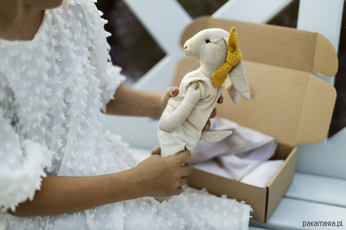 W zestawie Zajączek ma swoją własną pościel - materac, poduszkę, kołderkę i pachnący lawendą jasieczek. Wszystko zapakowane w pudełko i elegancką bibułkę - gotowe do wręczenia na prezent.
