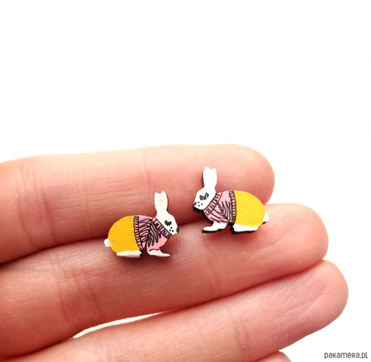 Lekkie kolczyki-sztyfty wykonane na podstawie autorskiego rysunku. Zrobione z drewna i lakierowane. Każda para będzie niepowtarzalna. Wielkość ok 1,5cm. Sztyfty nie uczulą, bo są z silikonu!