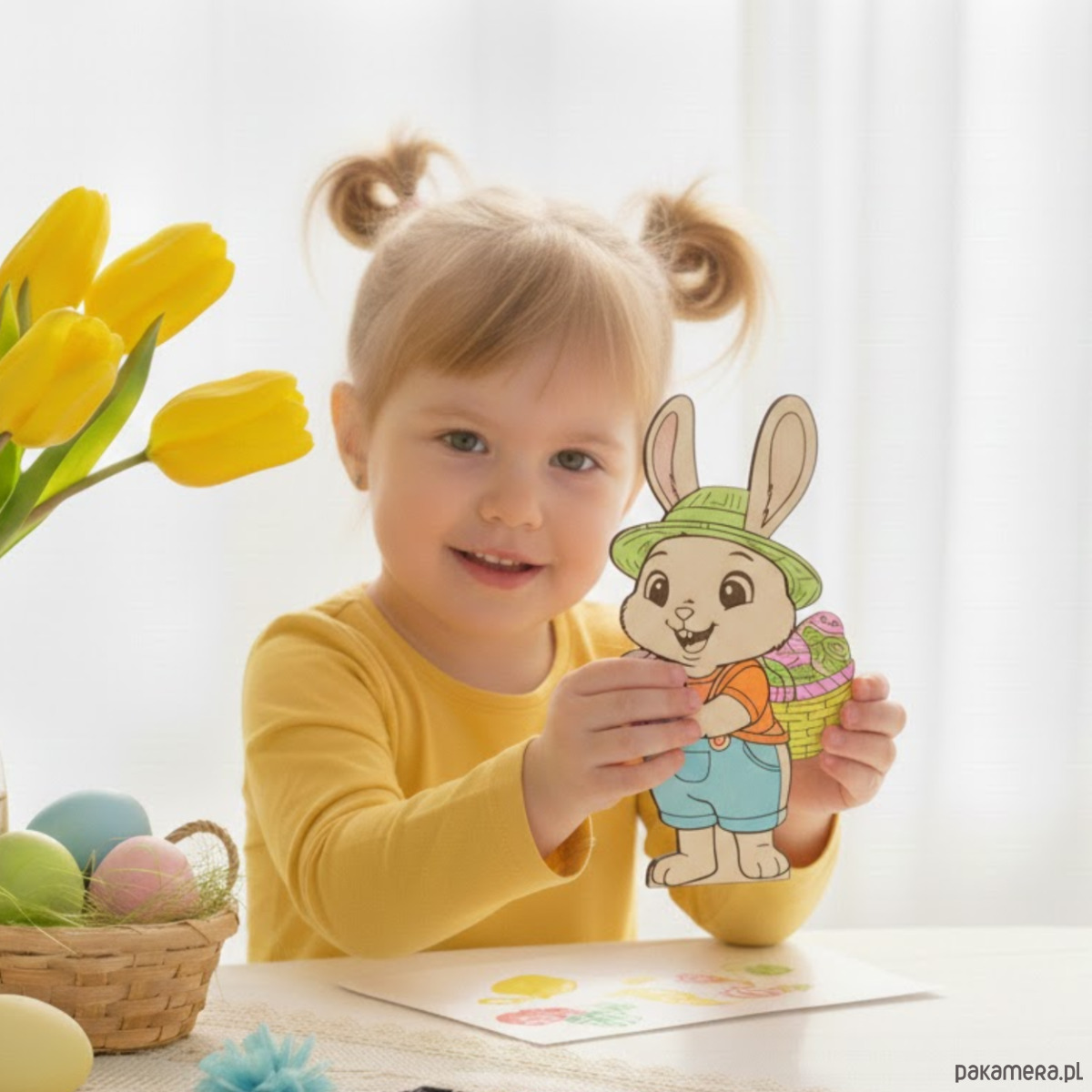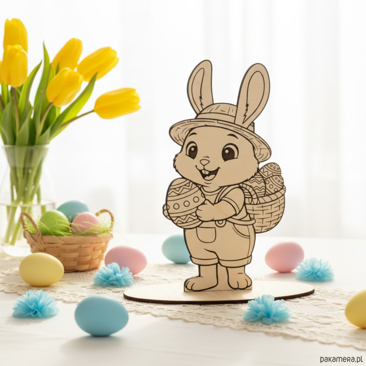 Drewniana figurka króliczka wielkanocnego ze sklejki brzozowej to idealna baza do malowania, kolorowania i dekorowania. Świetnie sprawdzi się w koszyczkach wielkanocnych, stroikach świątecznych czy projektach DIY, wprowadzając świąteczny nastrój do Twojego domu.