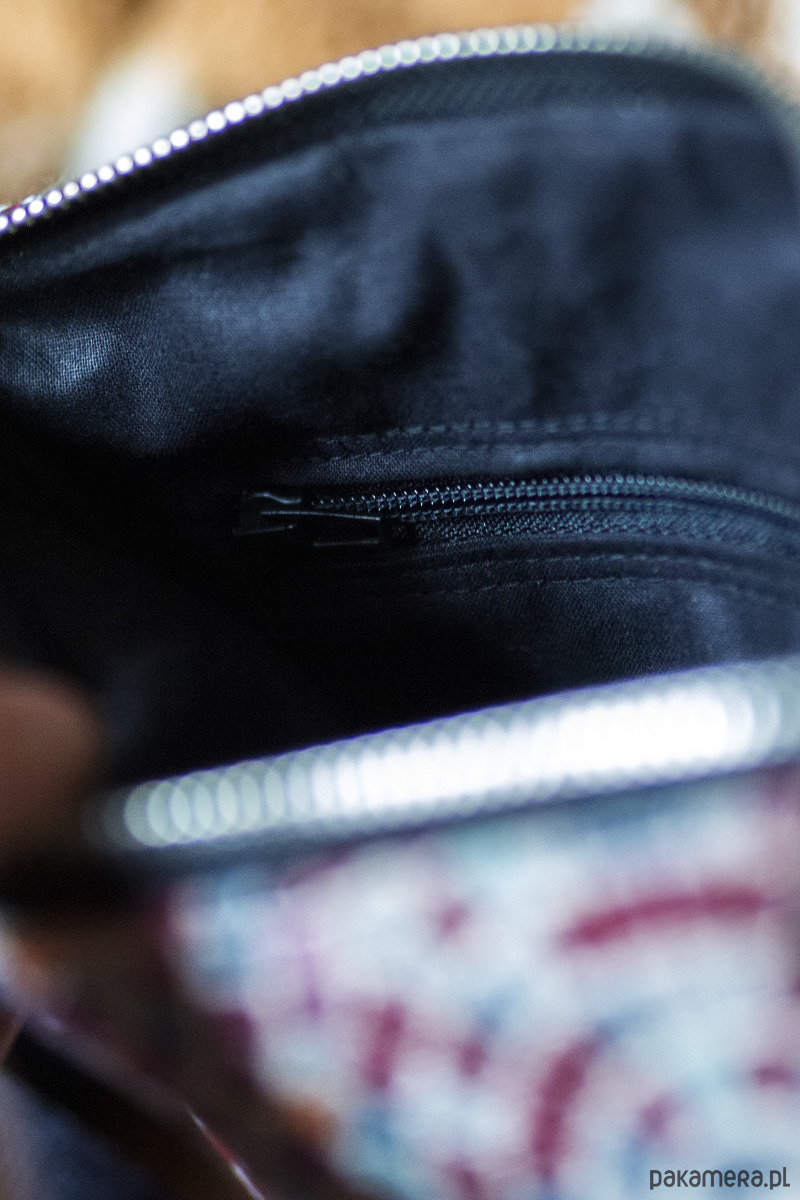 Małe zaszewki na dnie. Z tyłu oraz w środku torebki kieszonki zapinane na suwak. Środek wykończony bawełnianą podszewką.