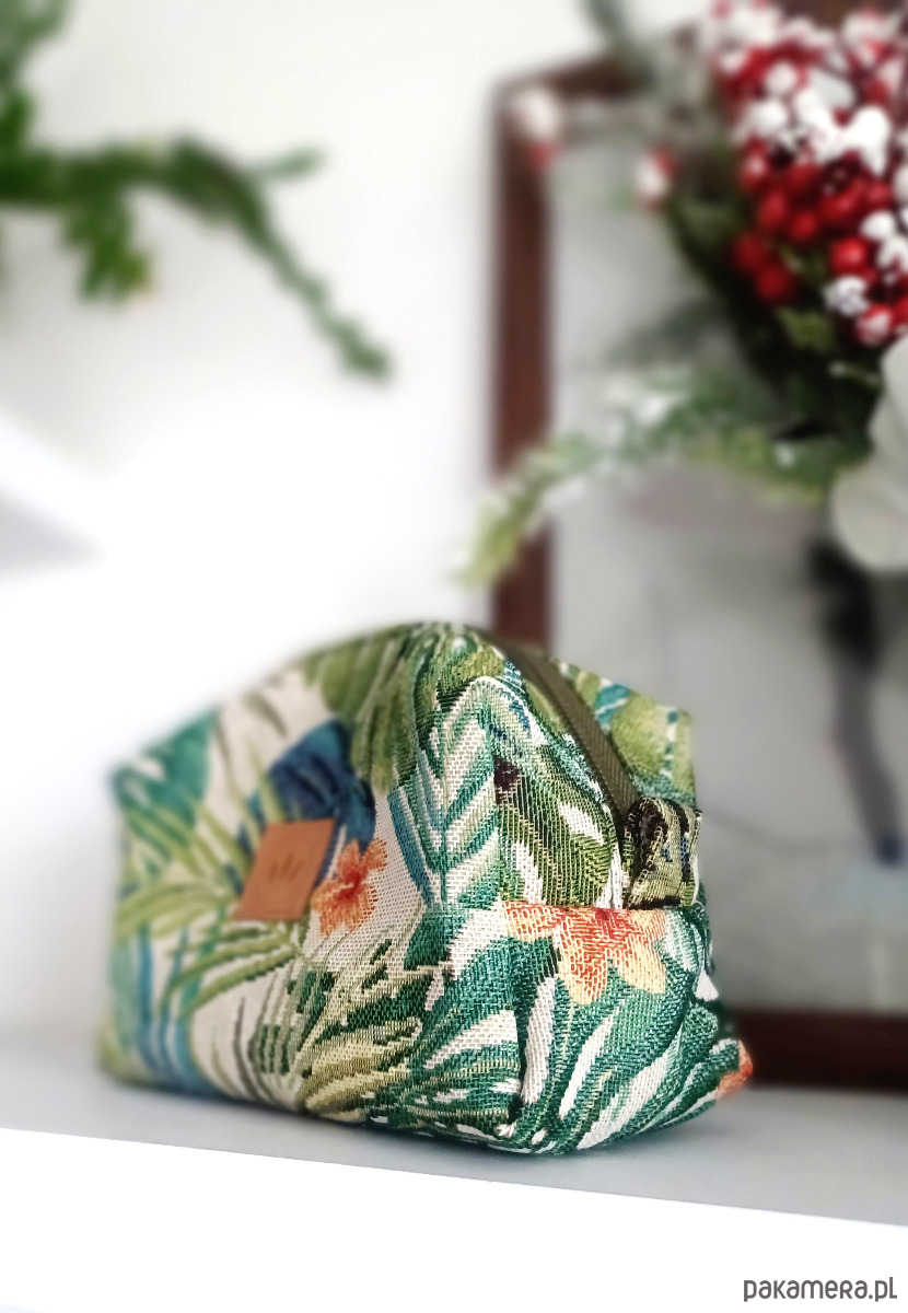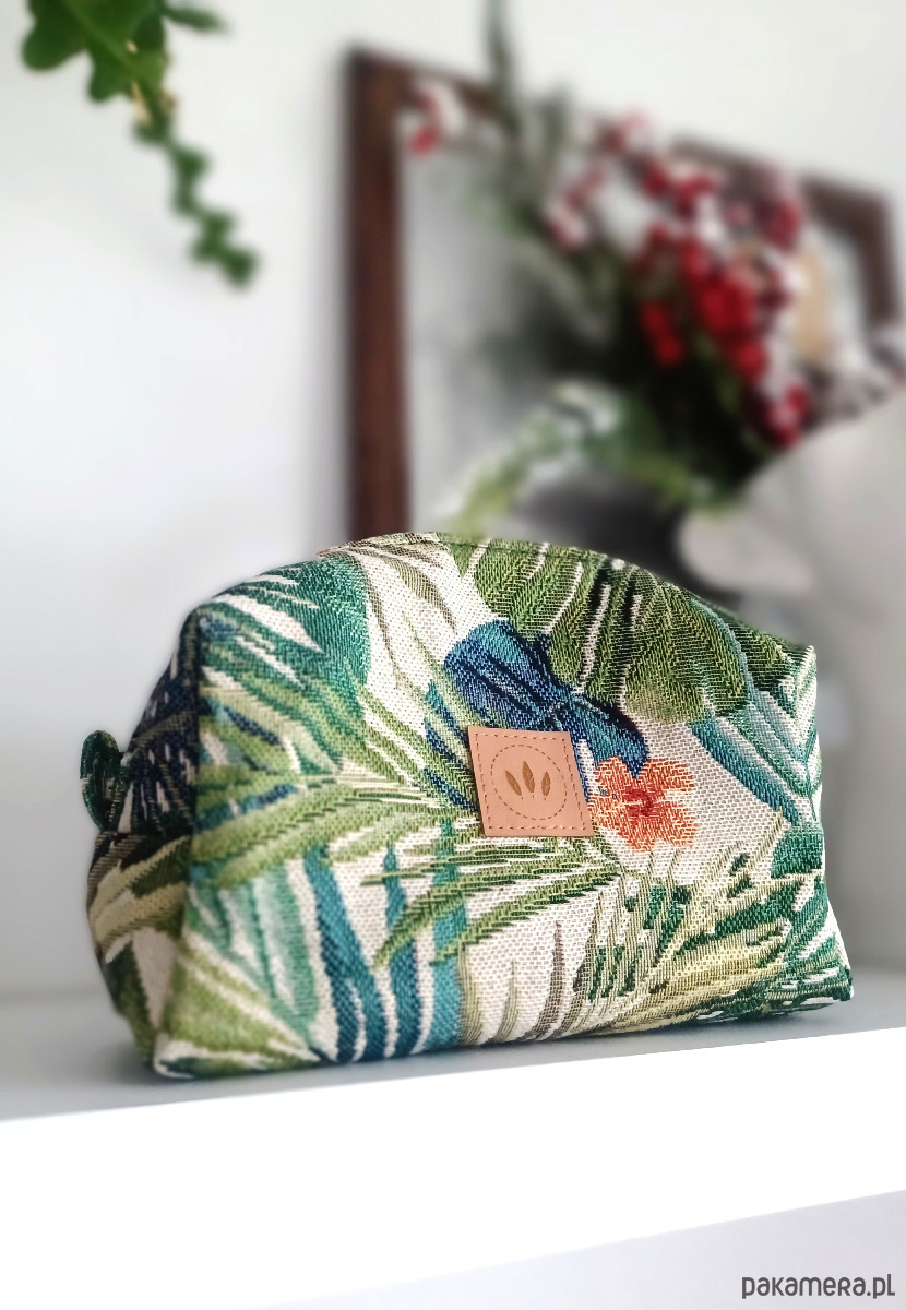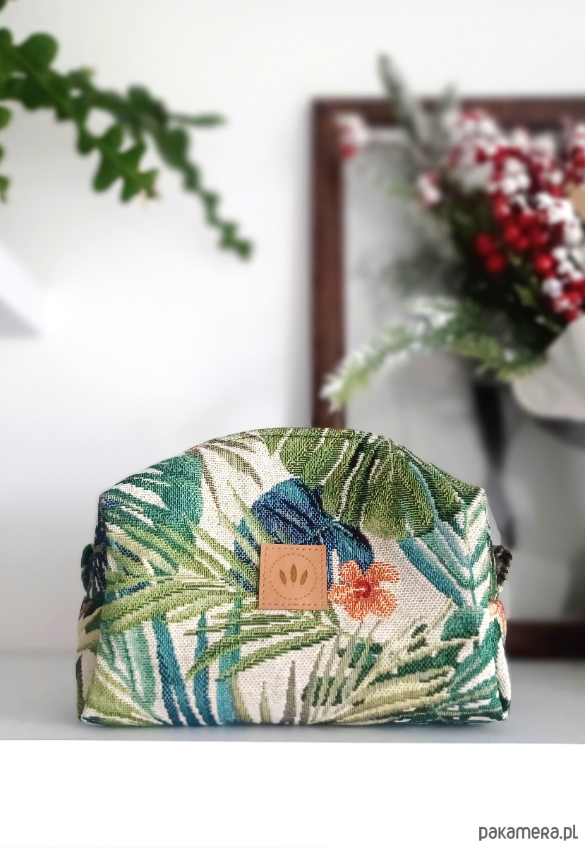 Średniej wielkości kosmetyczka z grubego żakardu z wzorem tropikalnej roślinności.