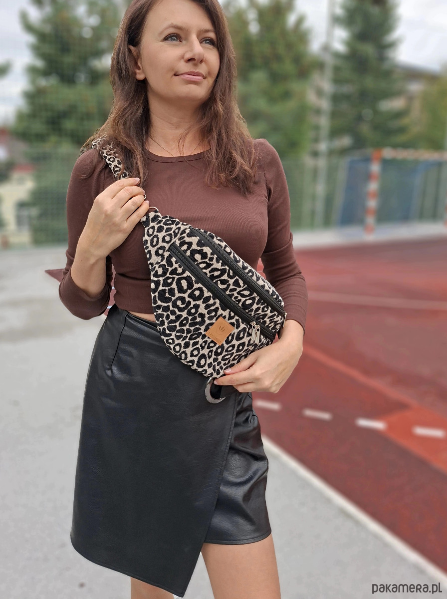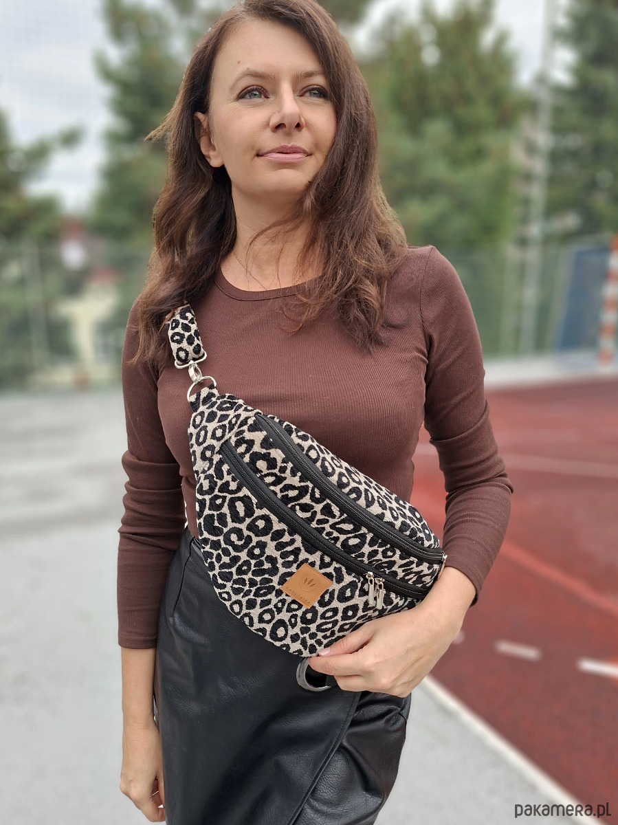 Bardzo duża nerka torebka damska z grubej, żakardowej tkaniny w panterkę.
