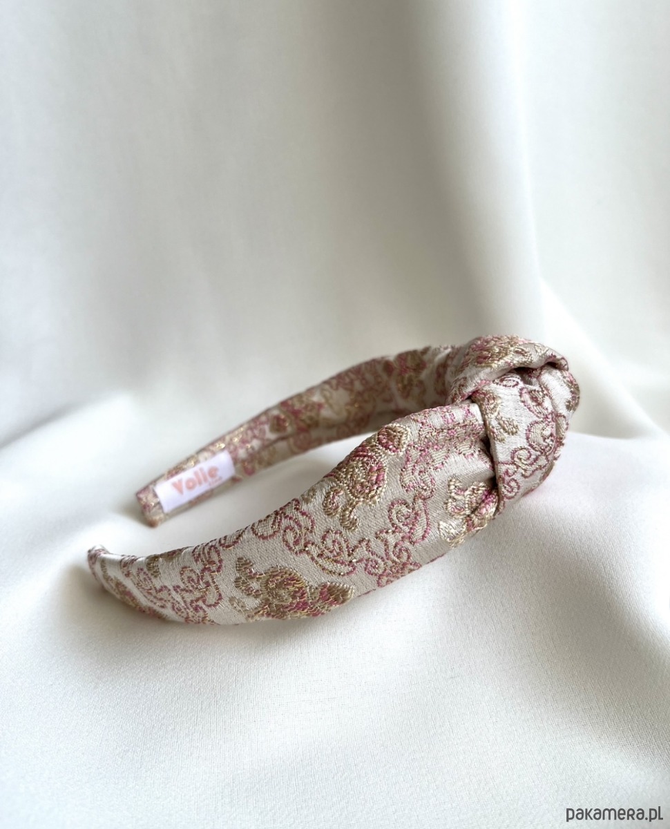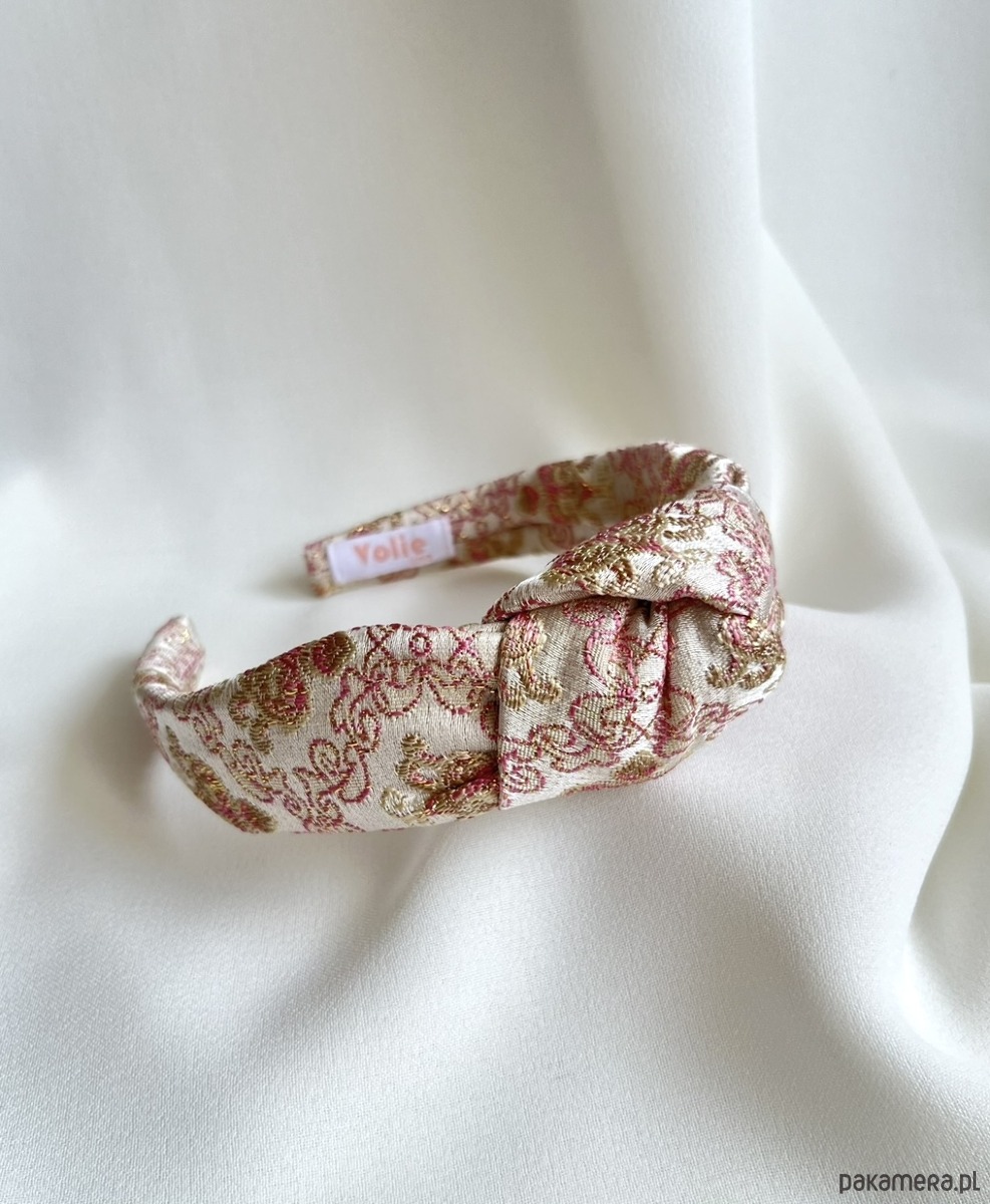 Uszyta z żakardu o błyszczącym wzorze w odcieniach różu i złota. Materiał subtelnie odbija światło, dzięki czemu opaska prezentuje się wyjątkowo elegancko – jak drobny, ale wyrazisty akcent biżuteryjny.