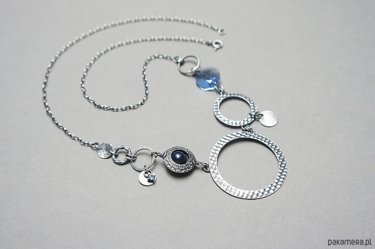 Naszyjnik wykonany ze srebra [pr. 925] w połączeniu z cyrkonią [3mm], kryształkiem Swarovski [12mm], naturalną perłą w koraliku przestrzennym [8mm] oraz srebrnymi blaszkami i ogniwami [8mm, 10mm,12mm,14mm,22mm,40mm]. Całość oksydowana i przetarta. Całkowita długość naszyjnika 57cm. Biżuteria ozdobnie zapakowana. Naszyjnik skomponowany tak, by mógł stanowić komplet z drugim naszyjnikiem widocznym na zdjęciach .