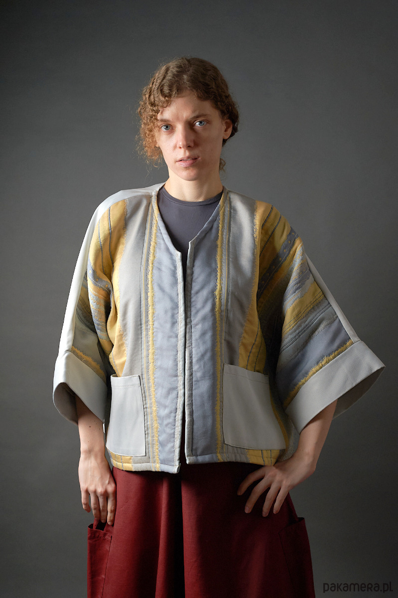 Żakiet kimonowy patchworkowy w kolorach niebiesko - żółtych.