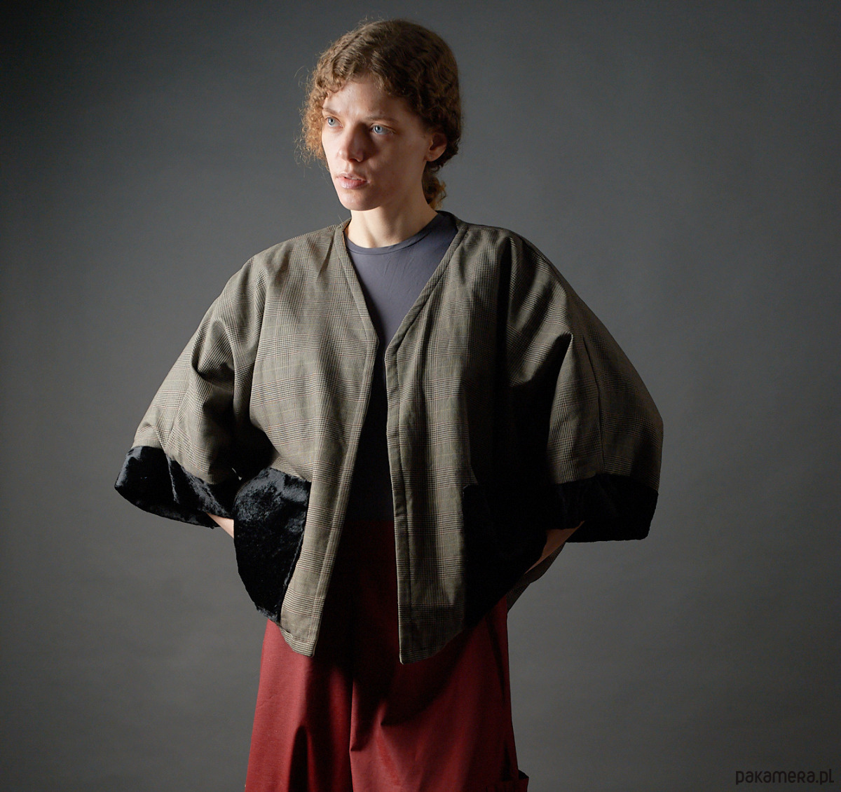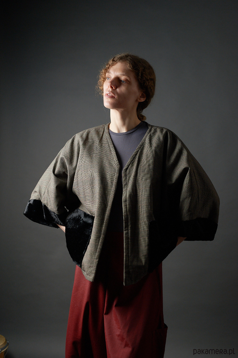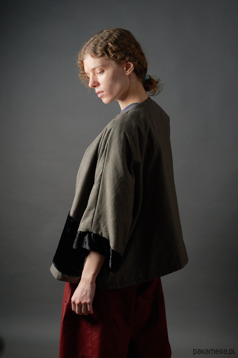Żakiet kimonowy w zieloną kratkę wykończany czarnym welurem j
