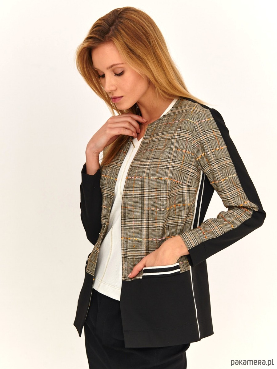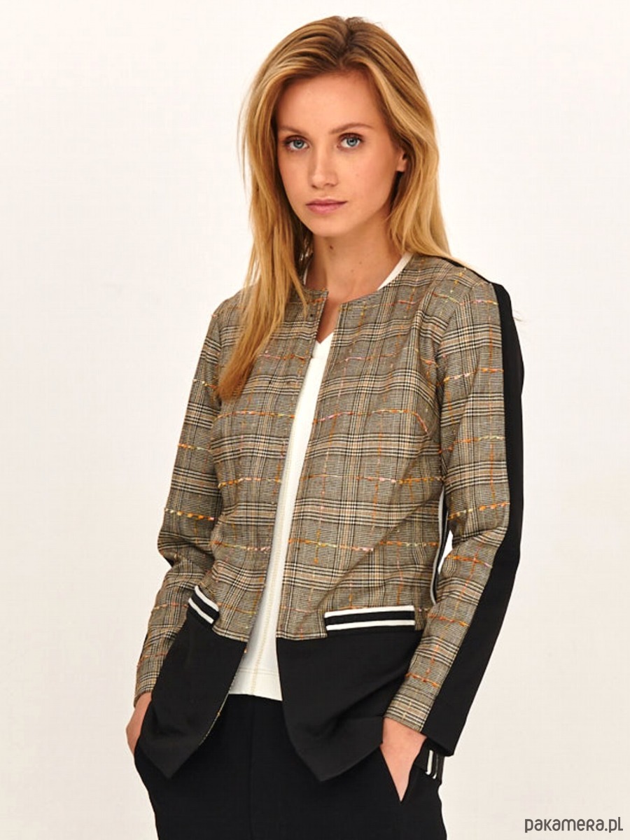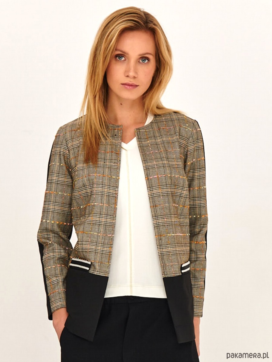 Żakiet w stylu sportowej elegancji - office . Dzianina typu punto - na tyle oraz w rękawach, z pewnością daje dużo komfortu. Krata - tkanina użyta jest na przodzie. Taśmy, podobnie jak delikatna krata na przodzie są charakterystycznymi elementami. Rękaw długi. Kieszenie na przodzie. Żakiet nie jest zapinany.