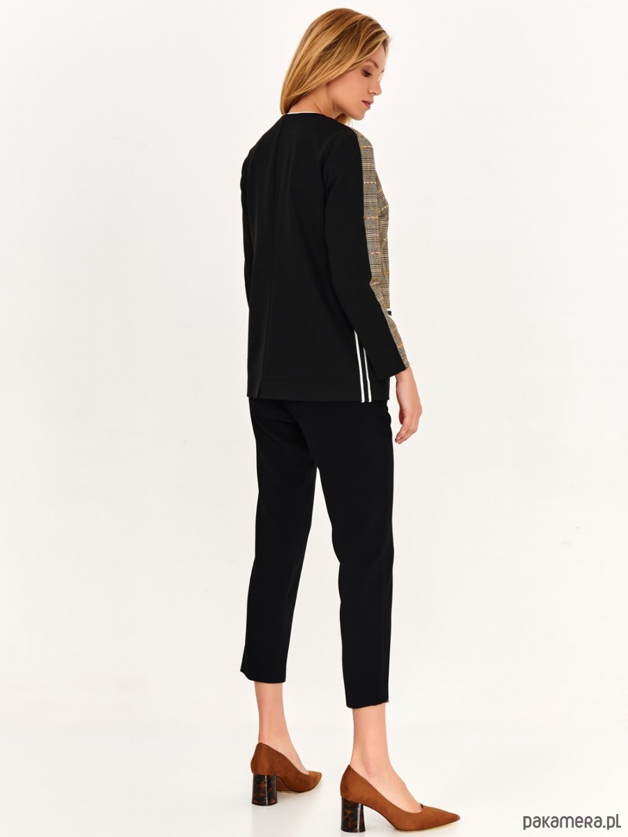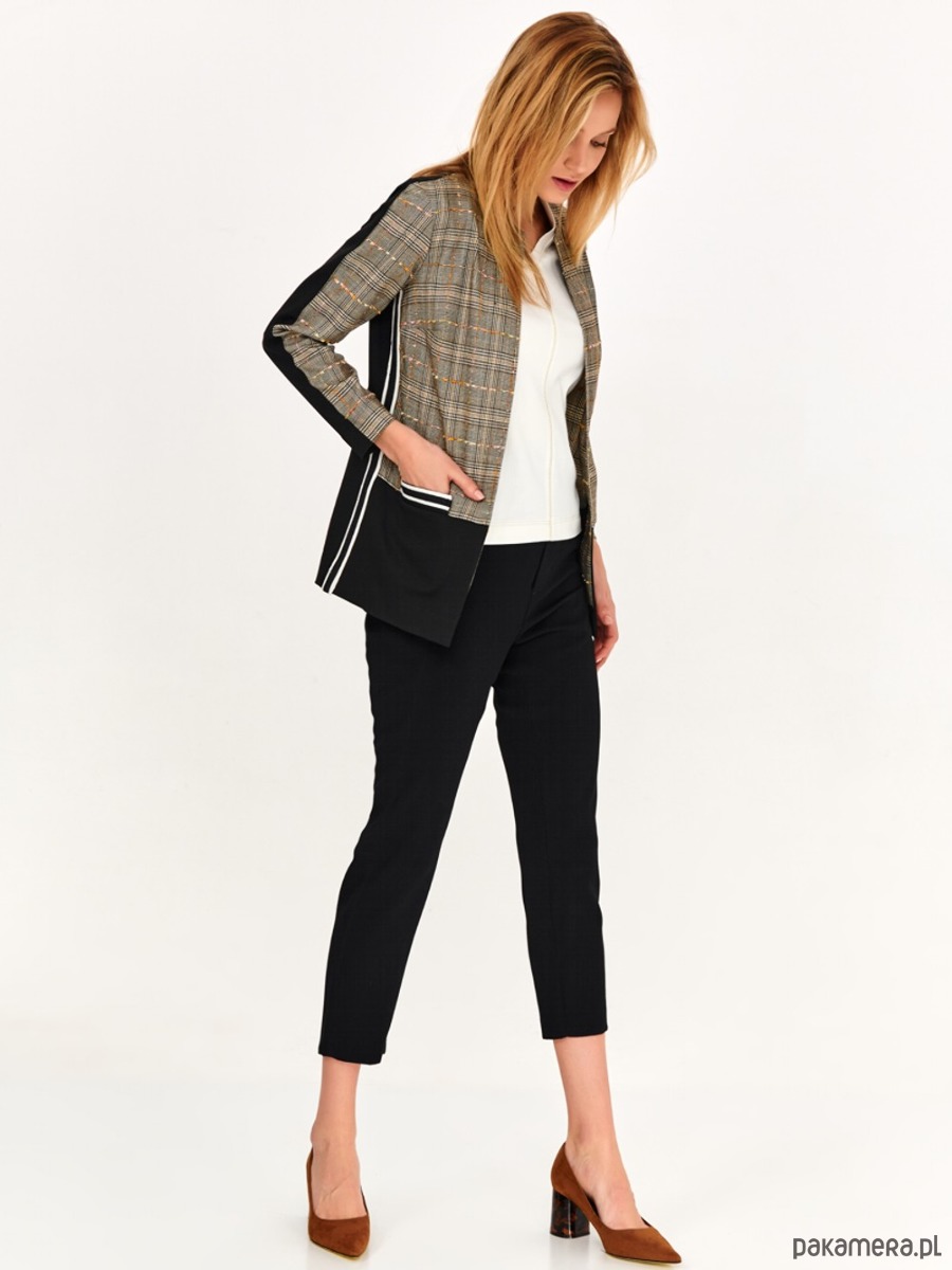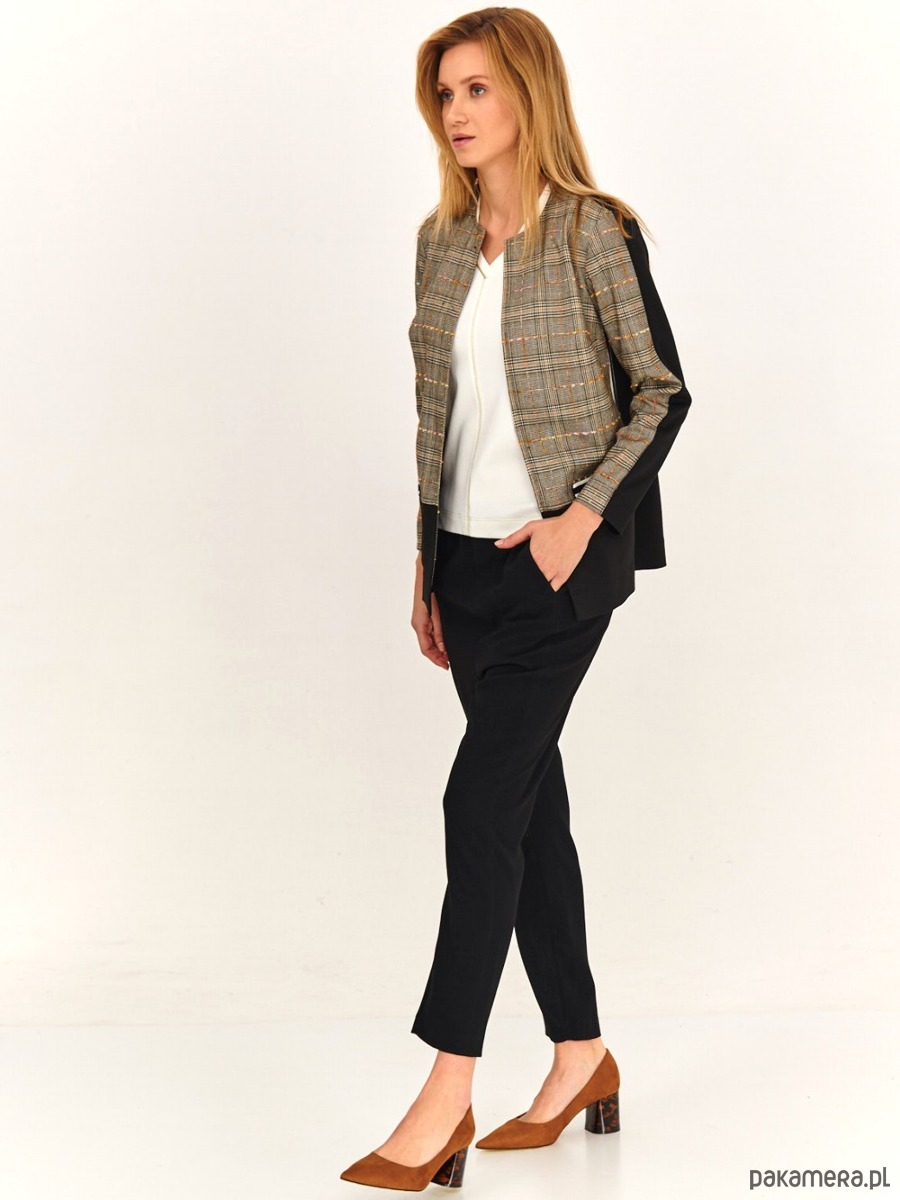 Żakiet w stylu sportowej elegancji - office . Dzianina typu punto - na tyle oraz w rękawach, z pewnością daje dużo komfortu. Krata - tkanina użyta jest na przodzie. Taśmy, podobnie jak delikatna krata na przodzie są charakterystycznymi elementami. Rękaw długi. Kieszenie na przodzie. Żakiet nie jest zapinany.
