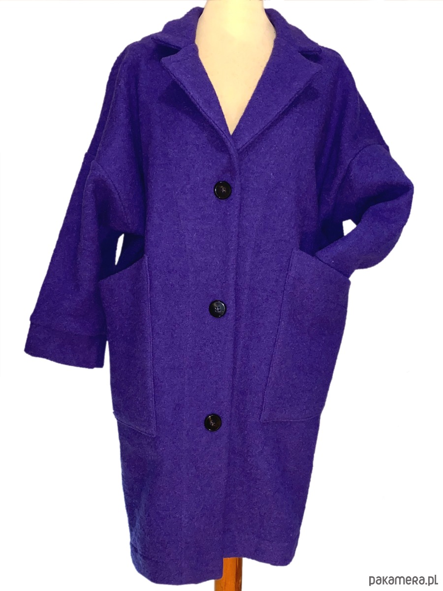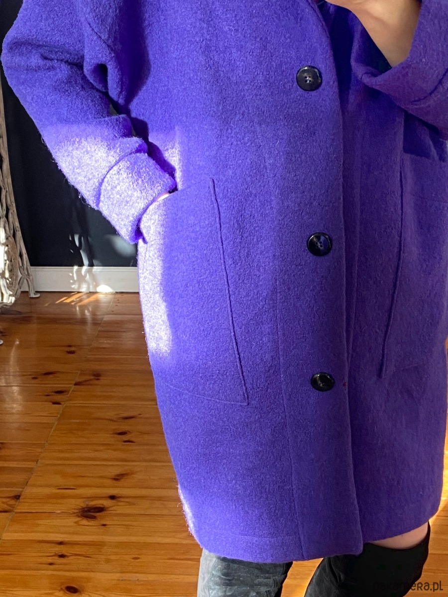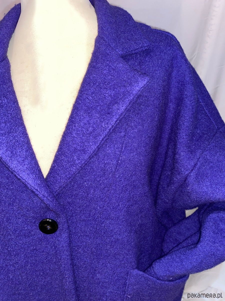Żakiet - płaszcz jest lekko od ciała - typu oversize. Płaszcz ma kołnierz i klapki oraz kieszenie. Zapięcie na napki, z imitacją z naszytych guzików. Od środka jest wykończona kontrastową lamowką. Rękaw 7/8. Tkanina to 100 % wełna typu bucle. Rozmiar dla 36 - 38 - 40 - będzie oversize, dla 42 - 44 swobodna marynarka.