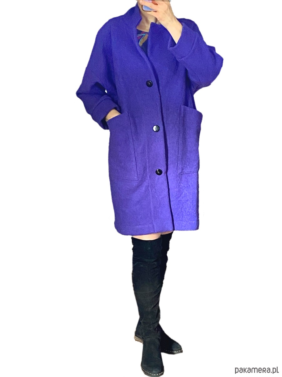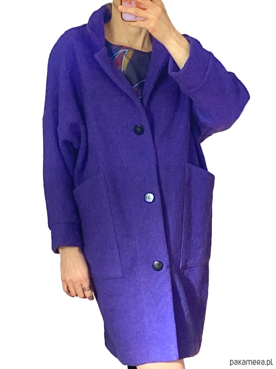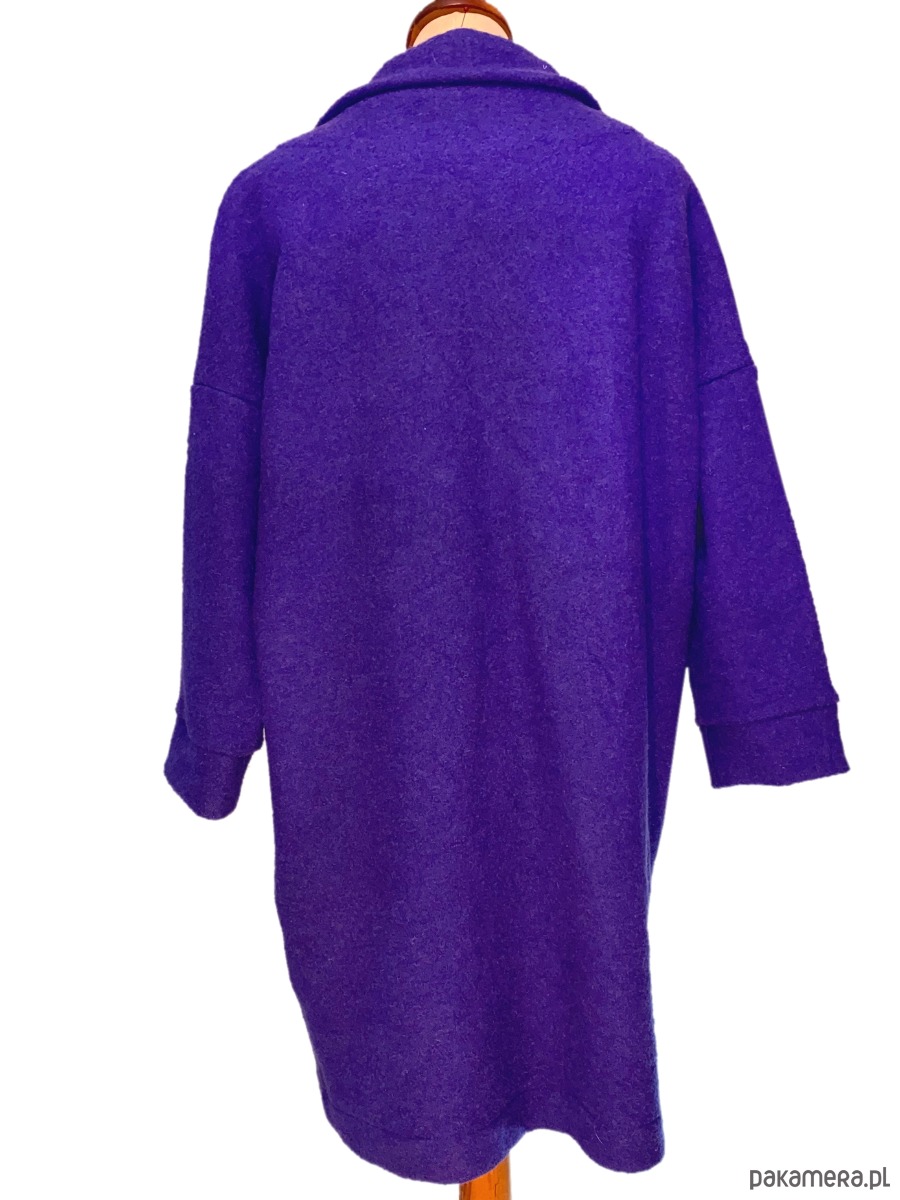 Żakiet - płaszcz jest lekko od ciała - typu oversize. Płaszcz ma kołnierz i klapki oraz kieszenie. Zapięcie na napki, z imitacją z naszytych guzików. Od środka jest wykończona kontrastową lamowką. Rękaw 7/8. Tkanina to 100 % wełna typu bucle. Rozmiar dla 36 - 38 - 40 - będzie oversize, dla 42 - 44 swobodna marynarka.