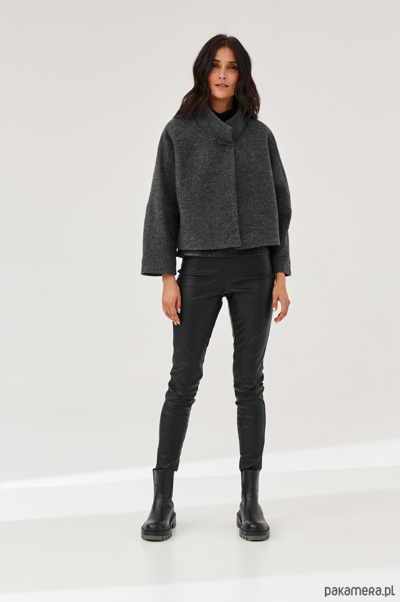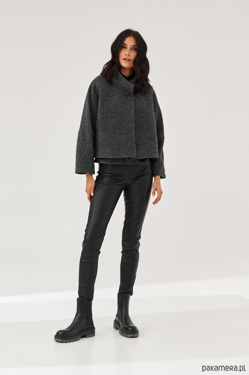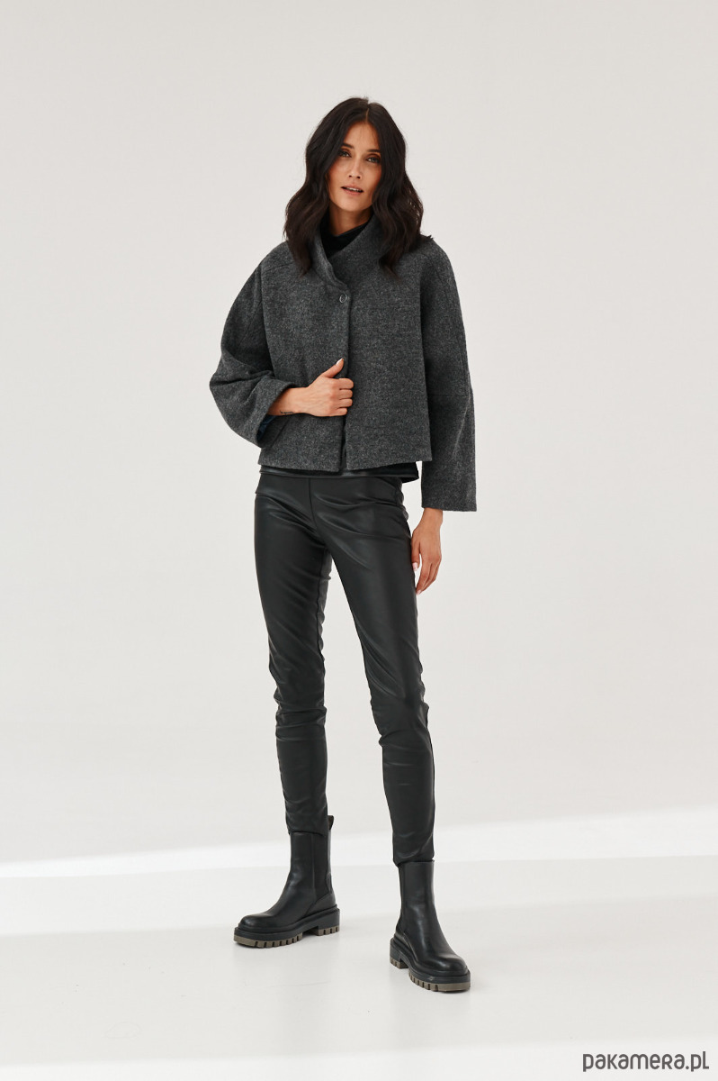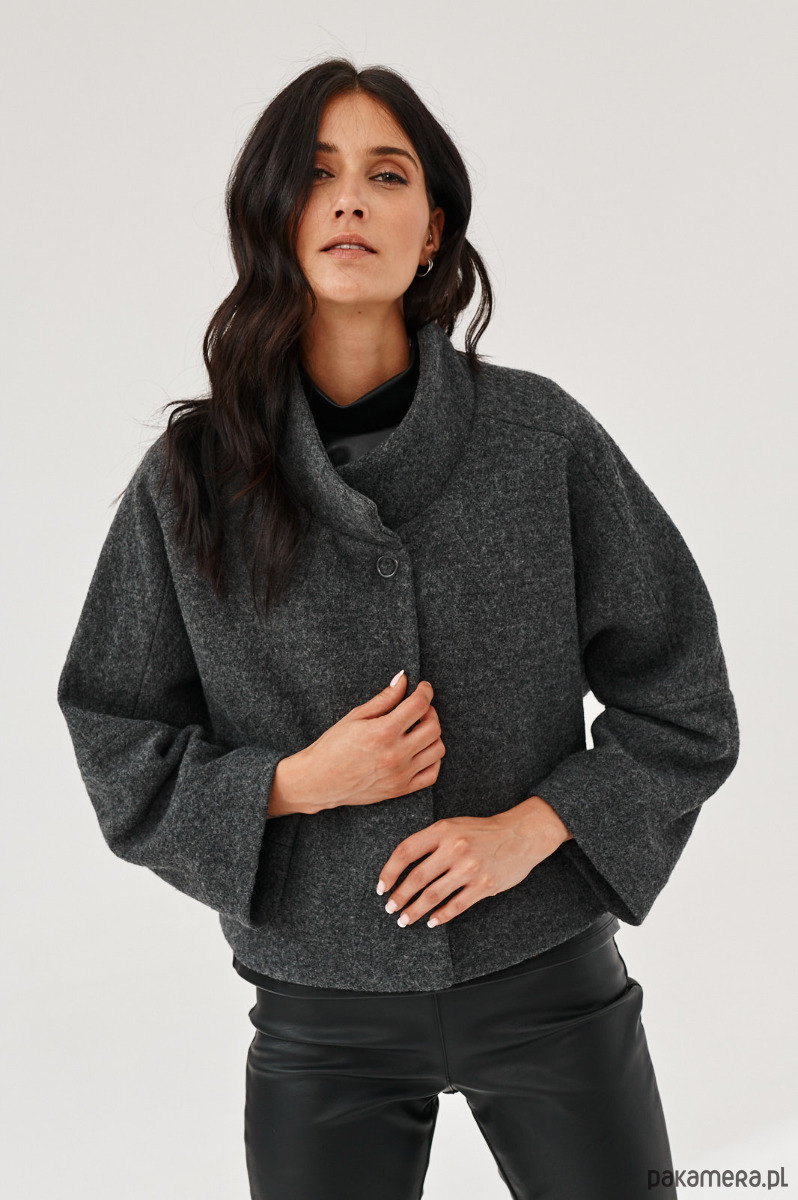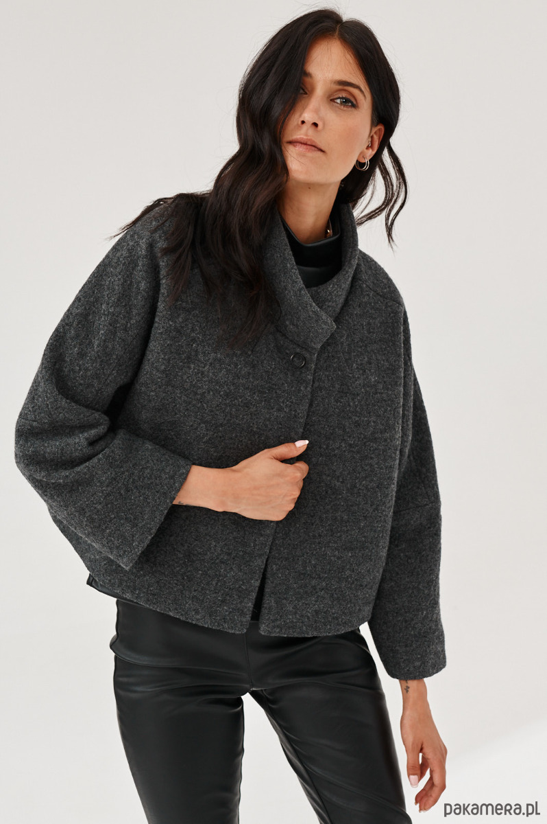 Kurtka - żakiet ALVA to kurtka z gotowanej wełny typu bucle. Forma marynarki to ciekawy kształt pudełka. Kurtka ma stójkę. Kurtka jest zapinana na napy-springi. Od środka jest wykończona piękną podszewką.