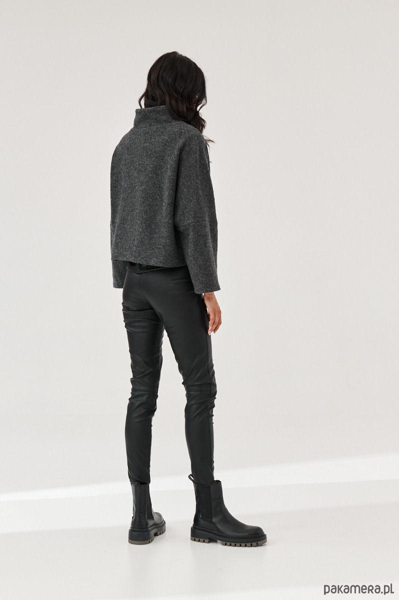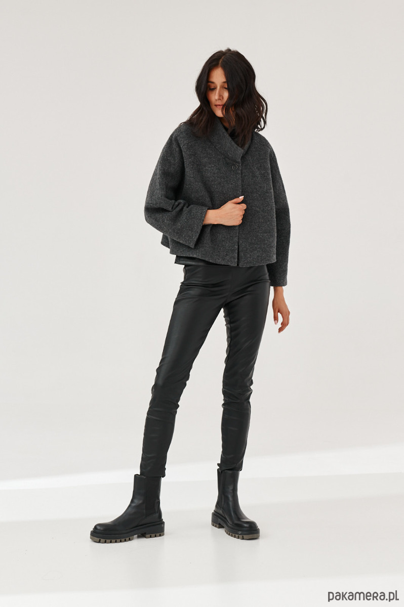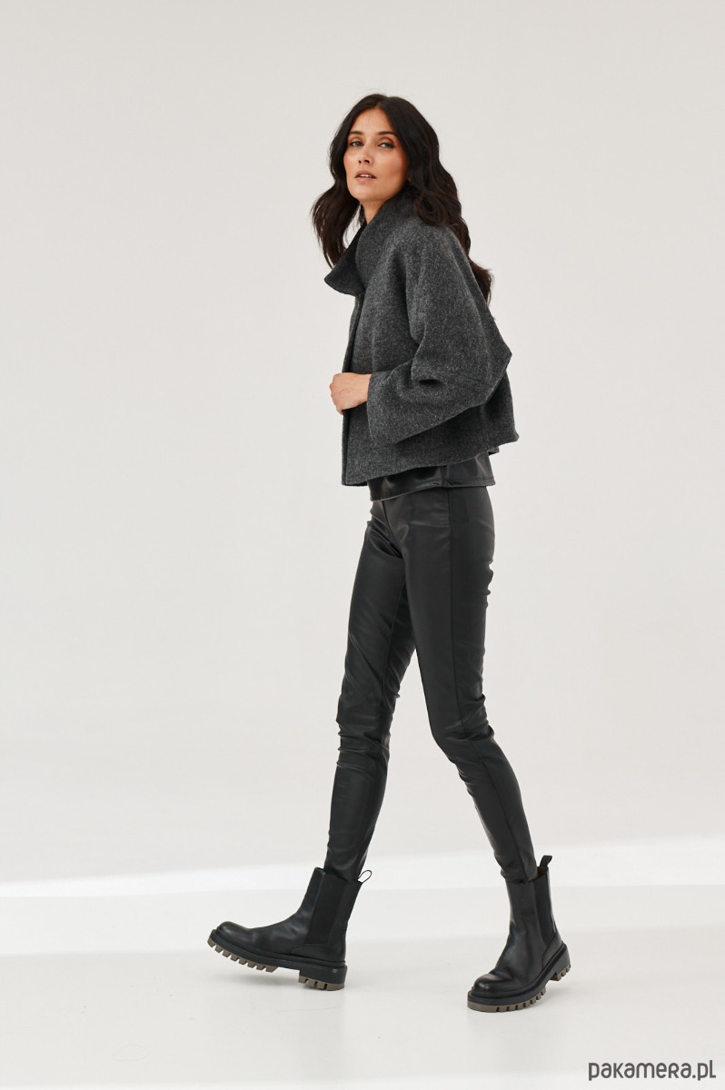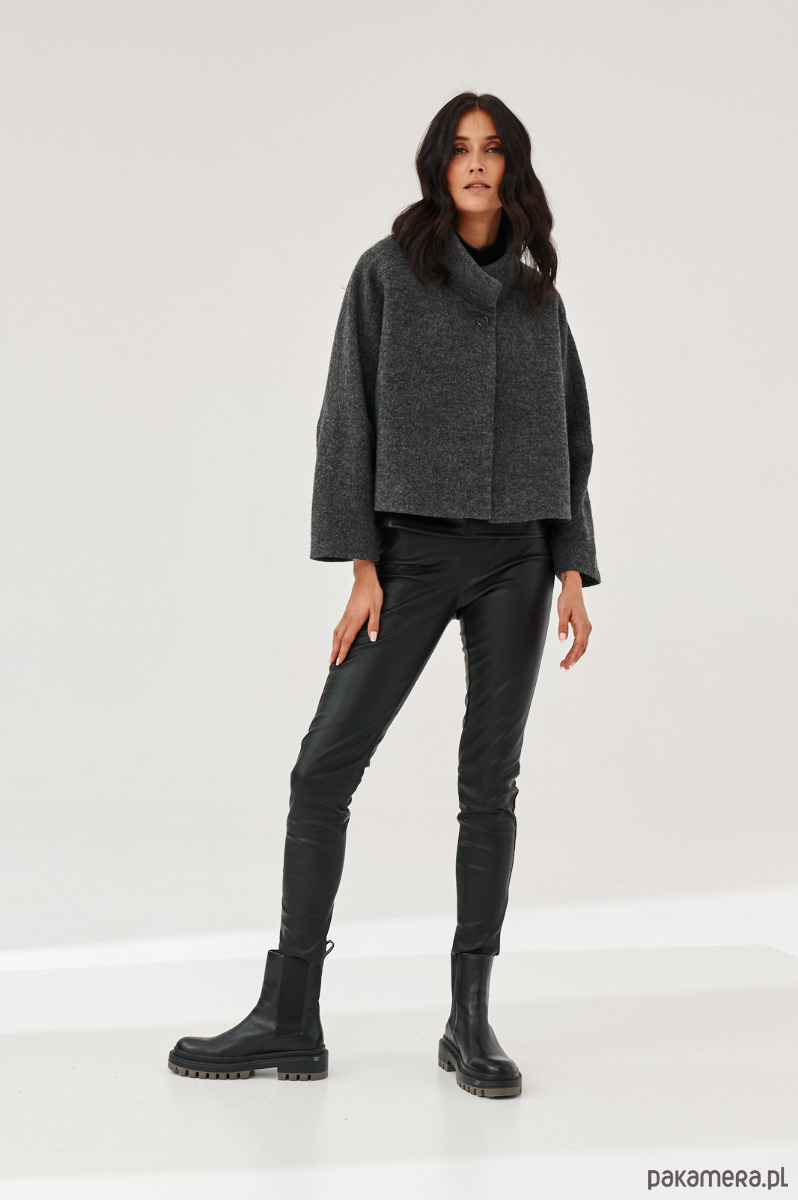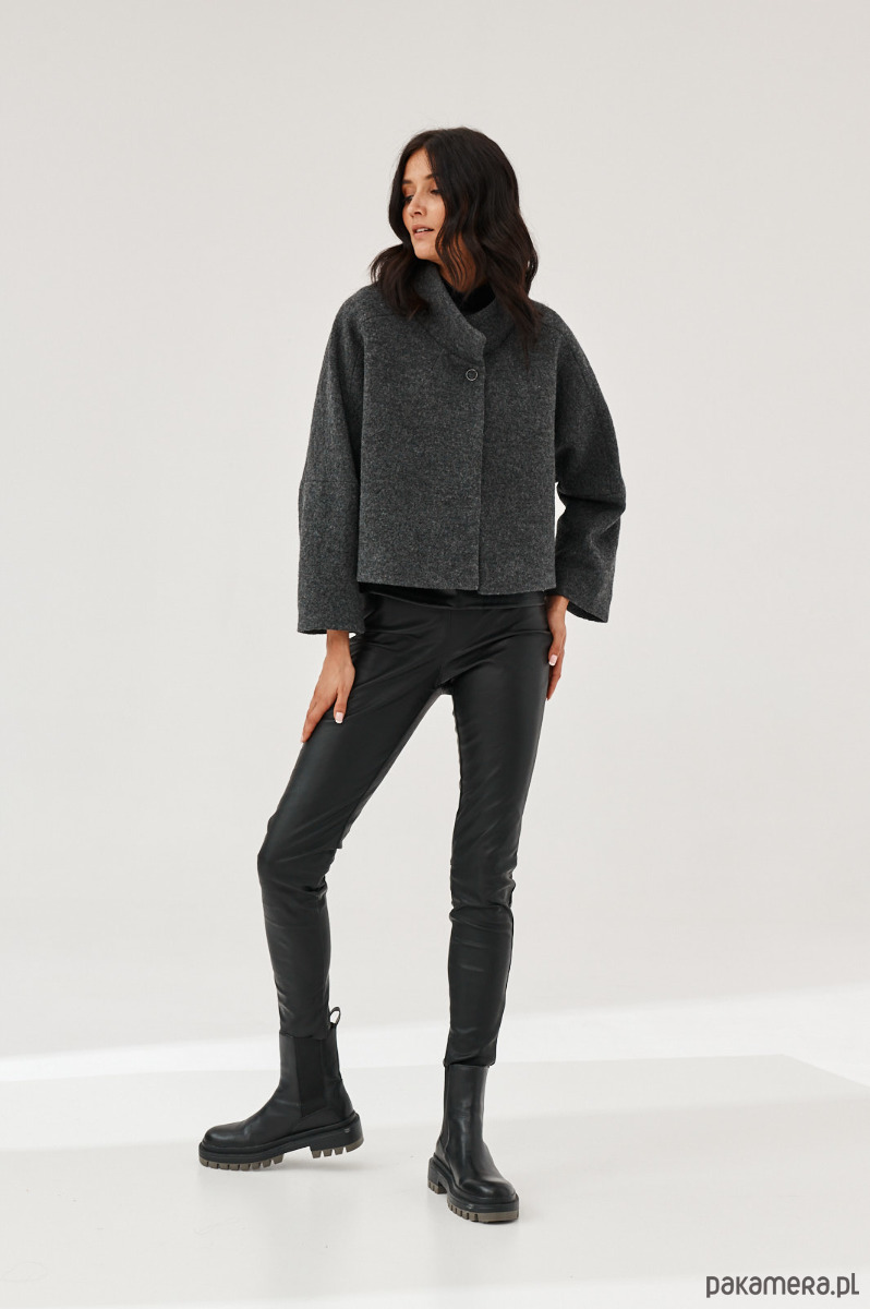 Kurtka - żakiet ALVA to kurtka z gotowanej wełny typu bucle. Forma marynarki to ciekawy kształt pudełka. Kurtka ma stójkę. Kurtka jest zapinana na napy-springi. Od środka jest wykończona piękną podszewką.