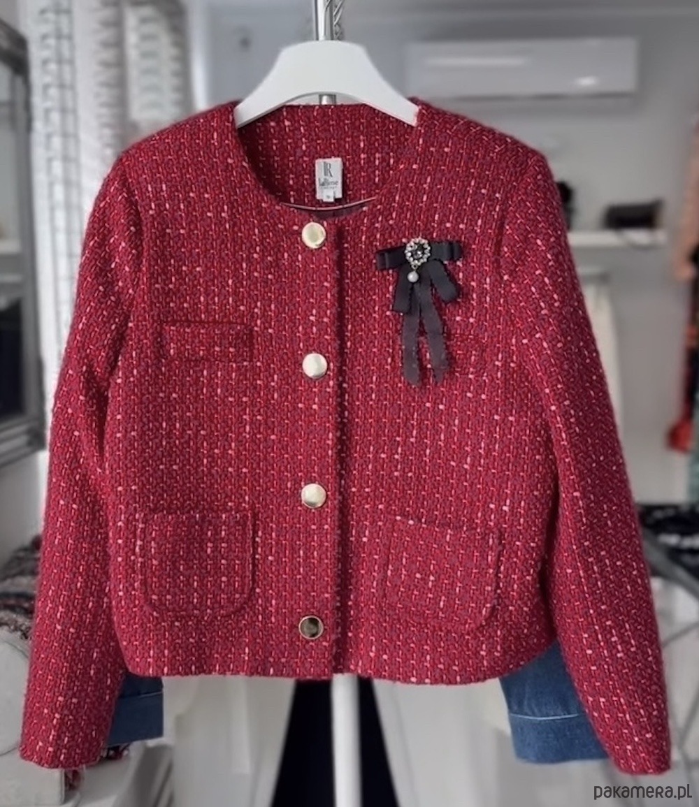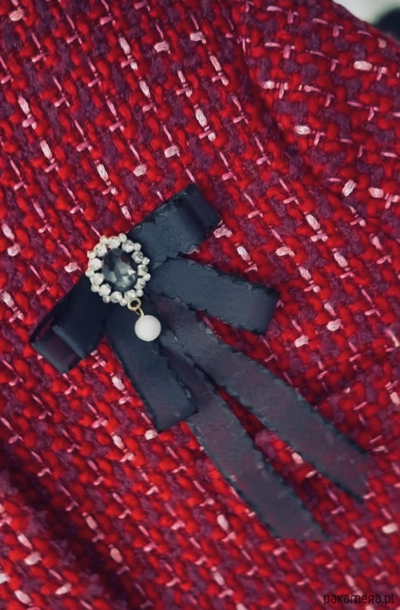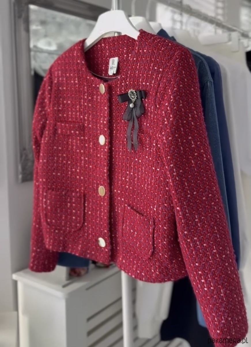 Żakiet Gerda typu chanelka. Subtelnie tkaną kratka. Tkanina wełna - VIRGIN WOOL. Przody ozdobione 2 rodzajami kieszonek. Efektowna przypinka w kolorze czarnym. Żakiet zapinana na 4 guziki w kolorze jasnego złota. Podszewka satynowa w kolorze wina z kontrastową wypustką.