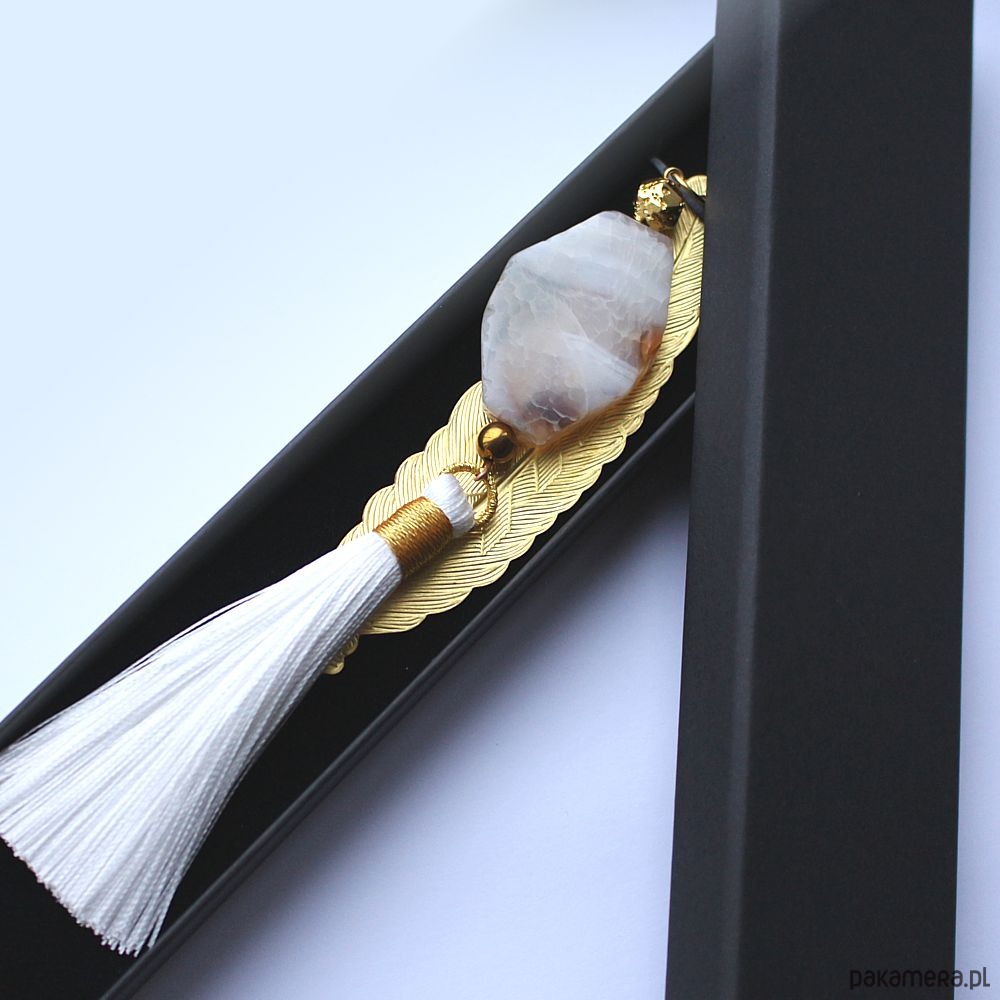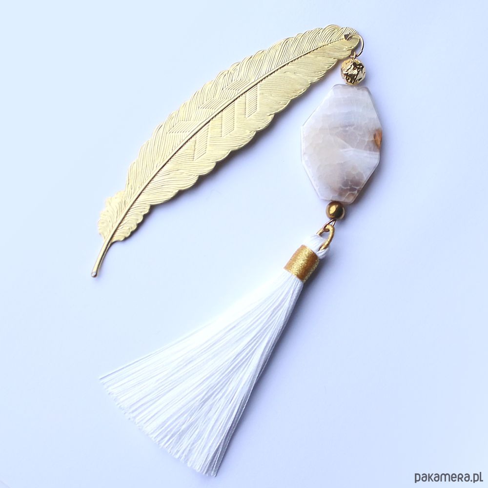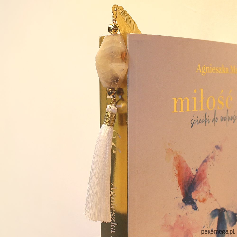 Elegancka etno zakładka do książki z chwostem, w odcieniu bieli, złota i beżu ozdobiona plastrem agatu, pozłacaną lawą wulkaniczną i hematytem.