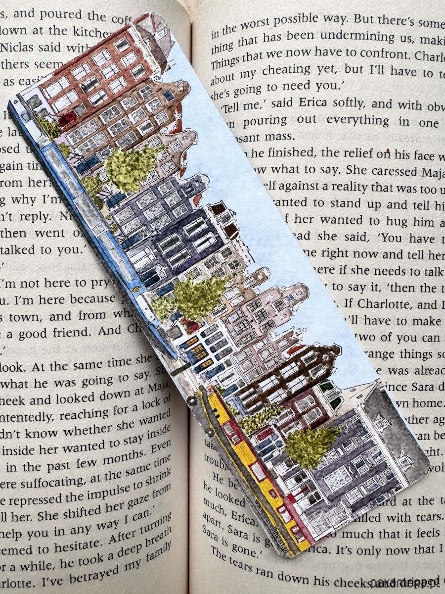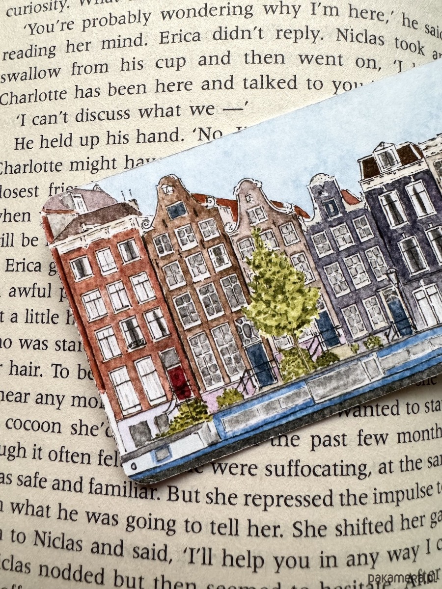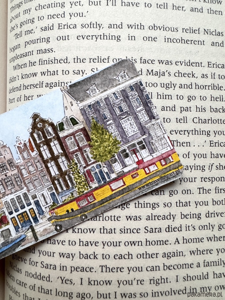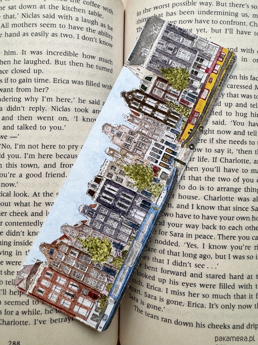 Zakładka z widokiem na charakterystyczne kamienice w Amsterdamie.