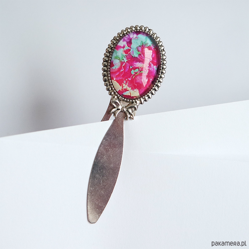 Grafika ukryta w pięknie zdobionej, romantycznej zakładce do książki pod osłoną przeźroczystego półokrągłego szkiełka.
