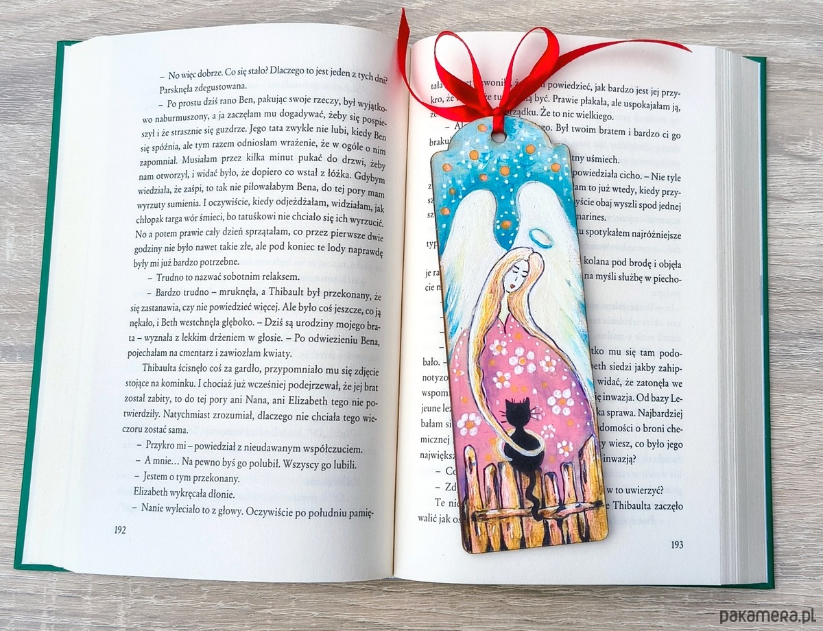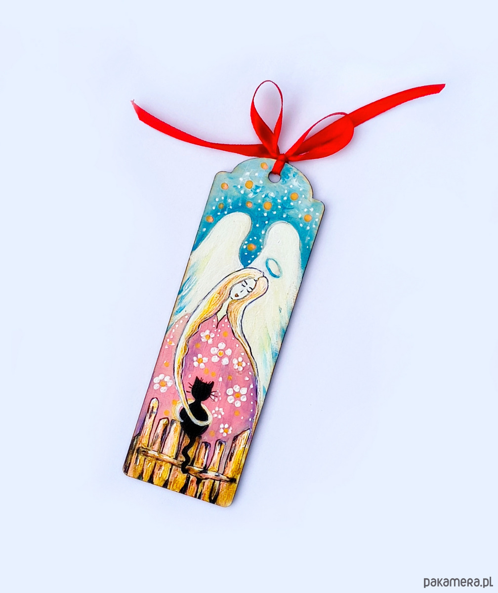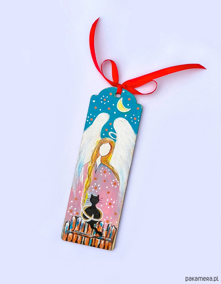 Wprowadź odrobinę magii do codzienności dzięki tej ręcznie wykonanej zakładce z ilustracją anioła. Zakładka malowana ręcznie, wykonana z drewna, zakończona ozdobną kokardką z czerwonej wstążki. Idealna jako prezent lub osobisty talizman do ulubionej książki.