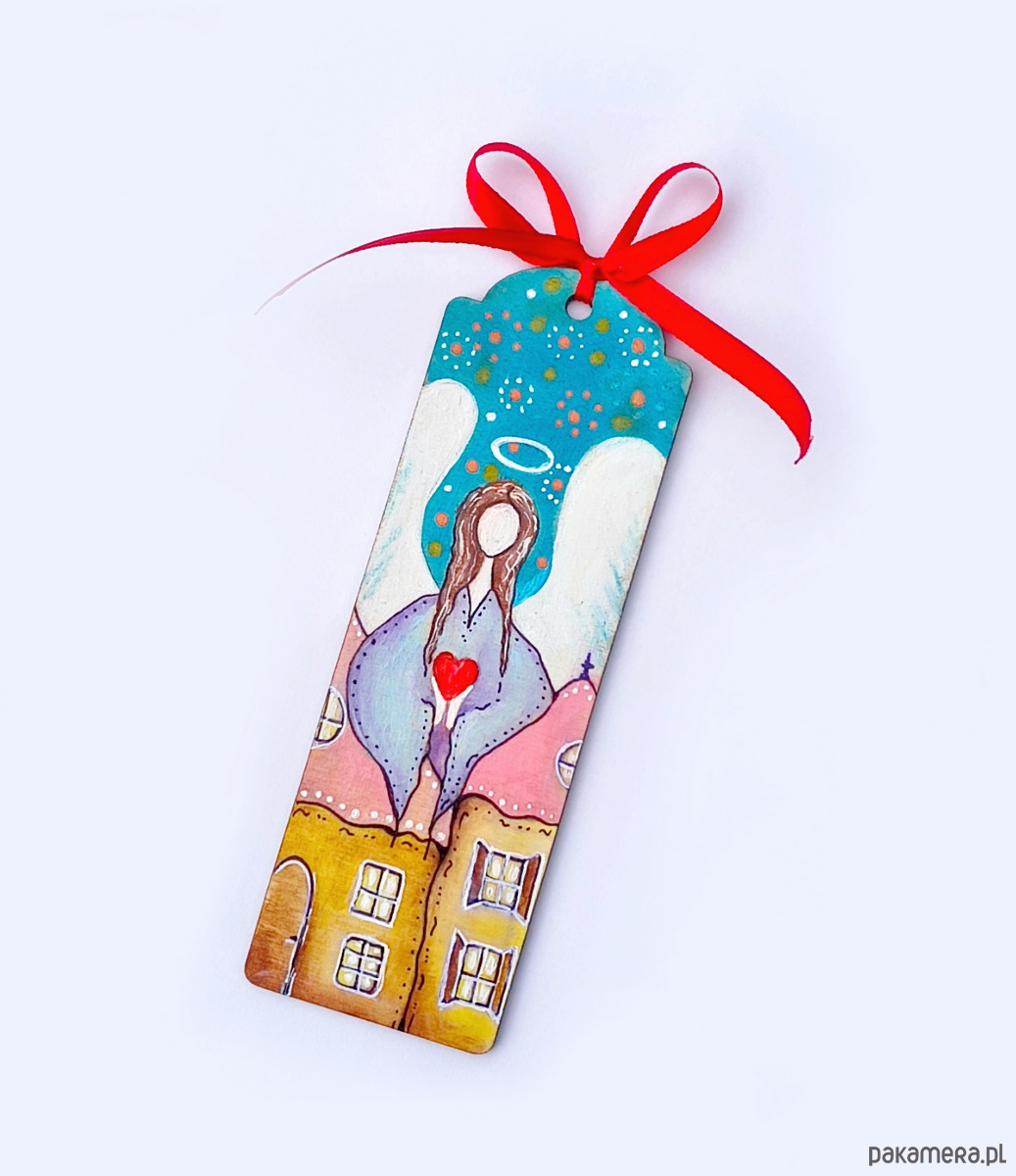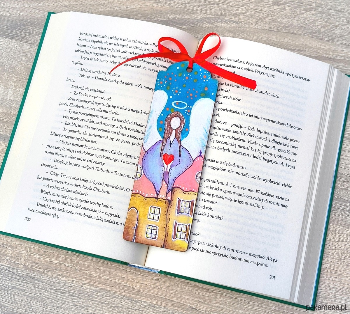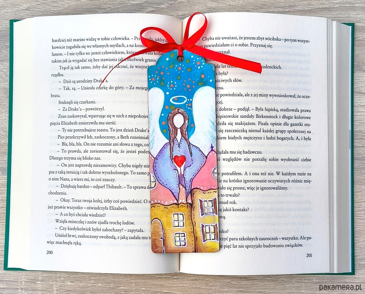 Wprowadź odrobinę magii do codzienności dzięki tej ręcznie wykonanej zakładce z ilustracją anioła. Zakładka malowana ręcznie, wykonana z drewna, zakończona ozdobną kokardką z czerwonej wstążki. Idealna jako prezent lub osobisty talizman do ulubionej książki.