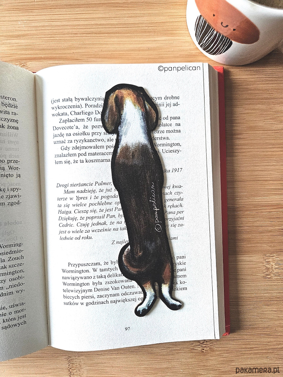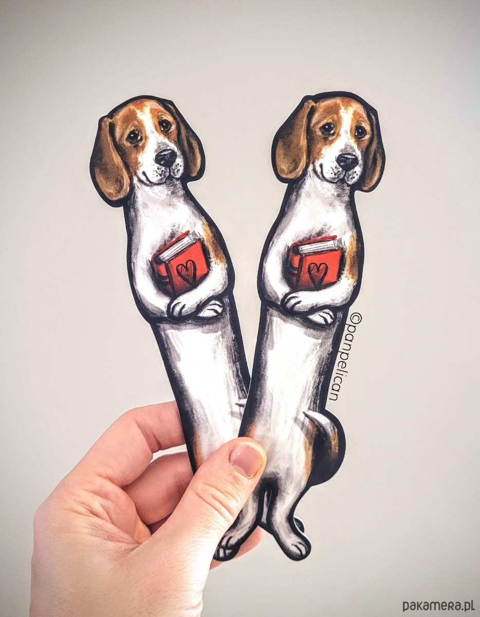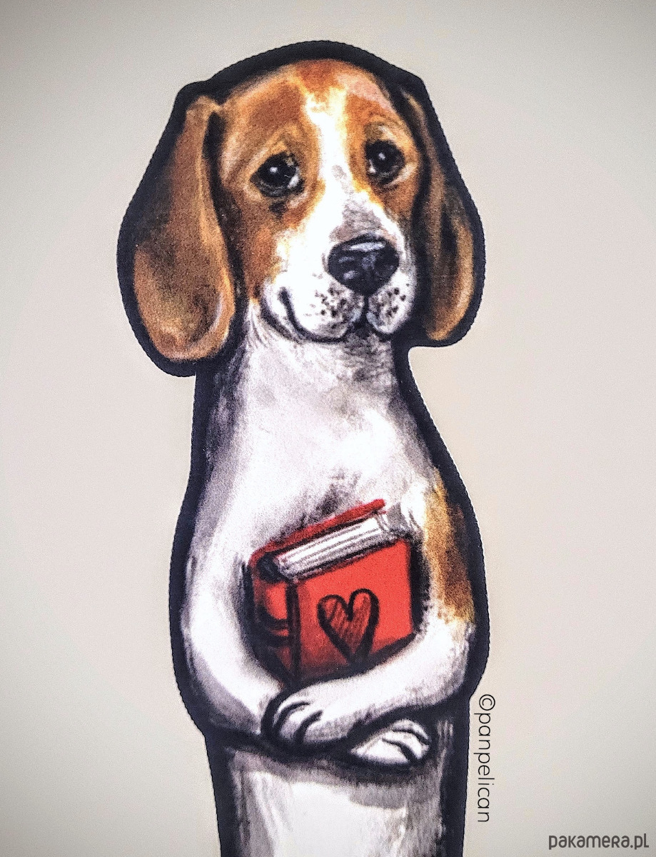 Autorska dwustronna zakładka do książki „Beagle Tosia”. Druk na ekotekturze premium, reprodukcja malowanego ręcznie wzoru.
