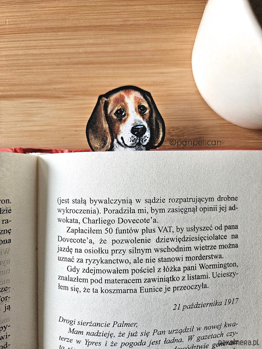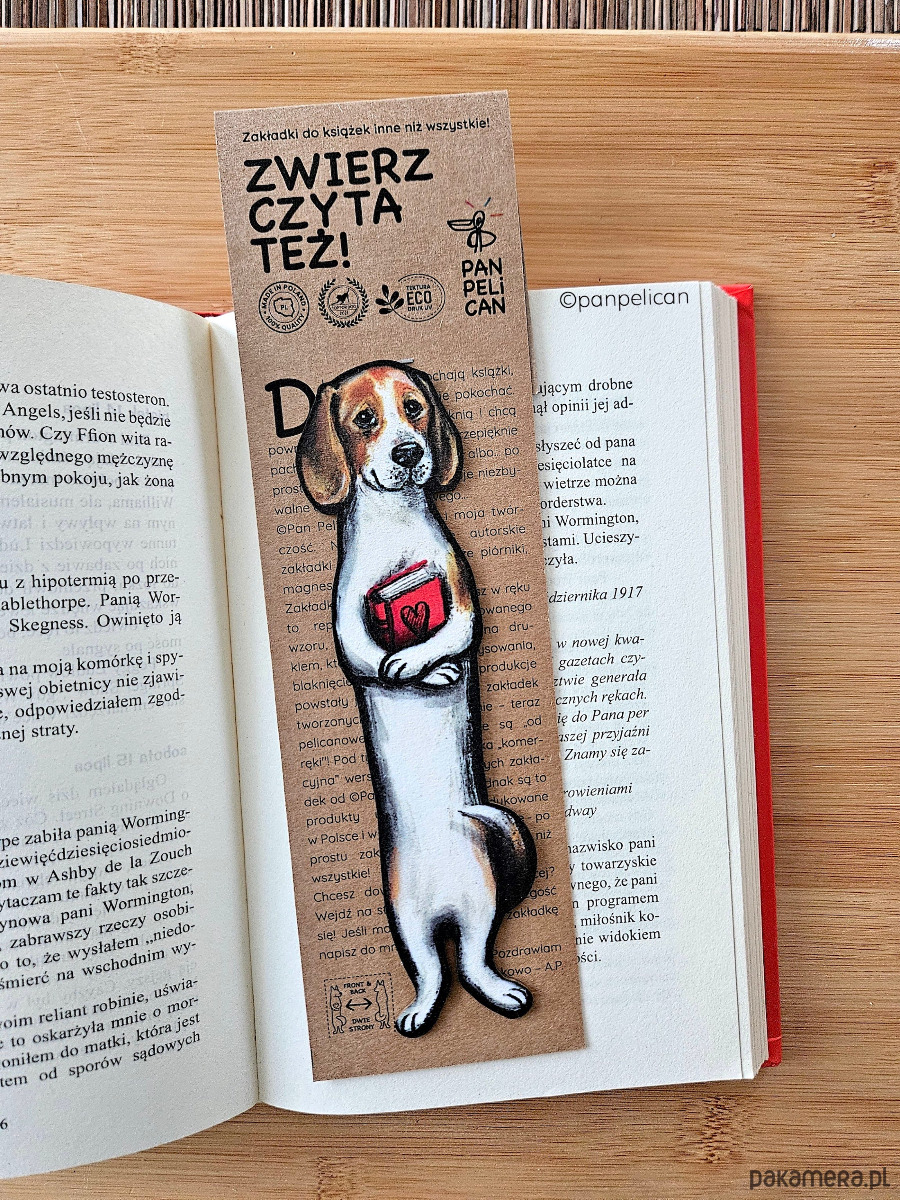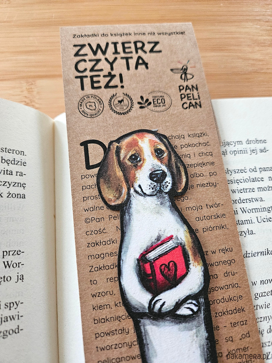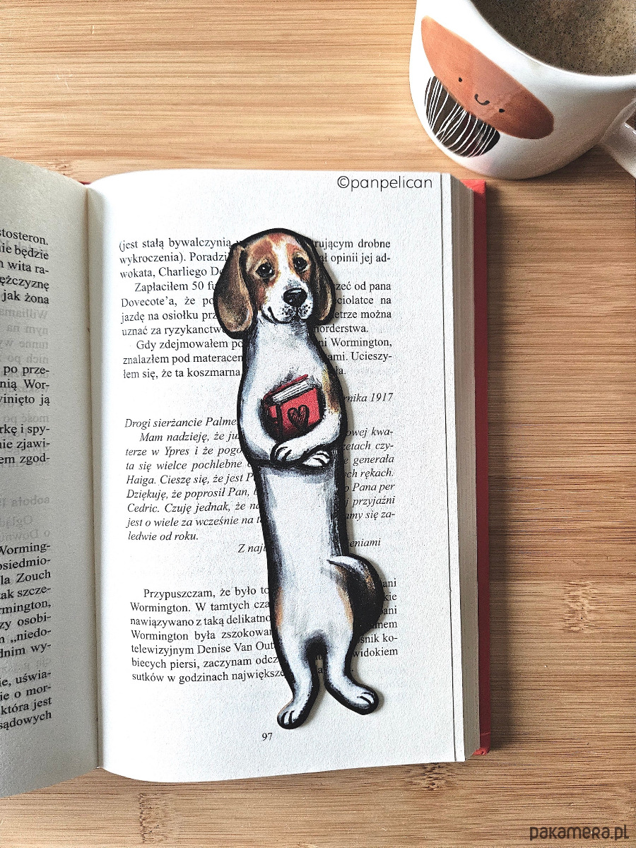 Autorska dwustronna zakładka do książki „Beagle Tosia”. Druk na ekotekturze premium, reprodukcja malowanego ręcznie wzoru.